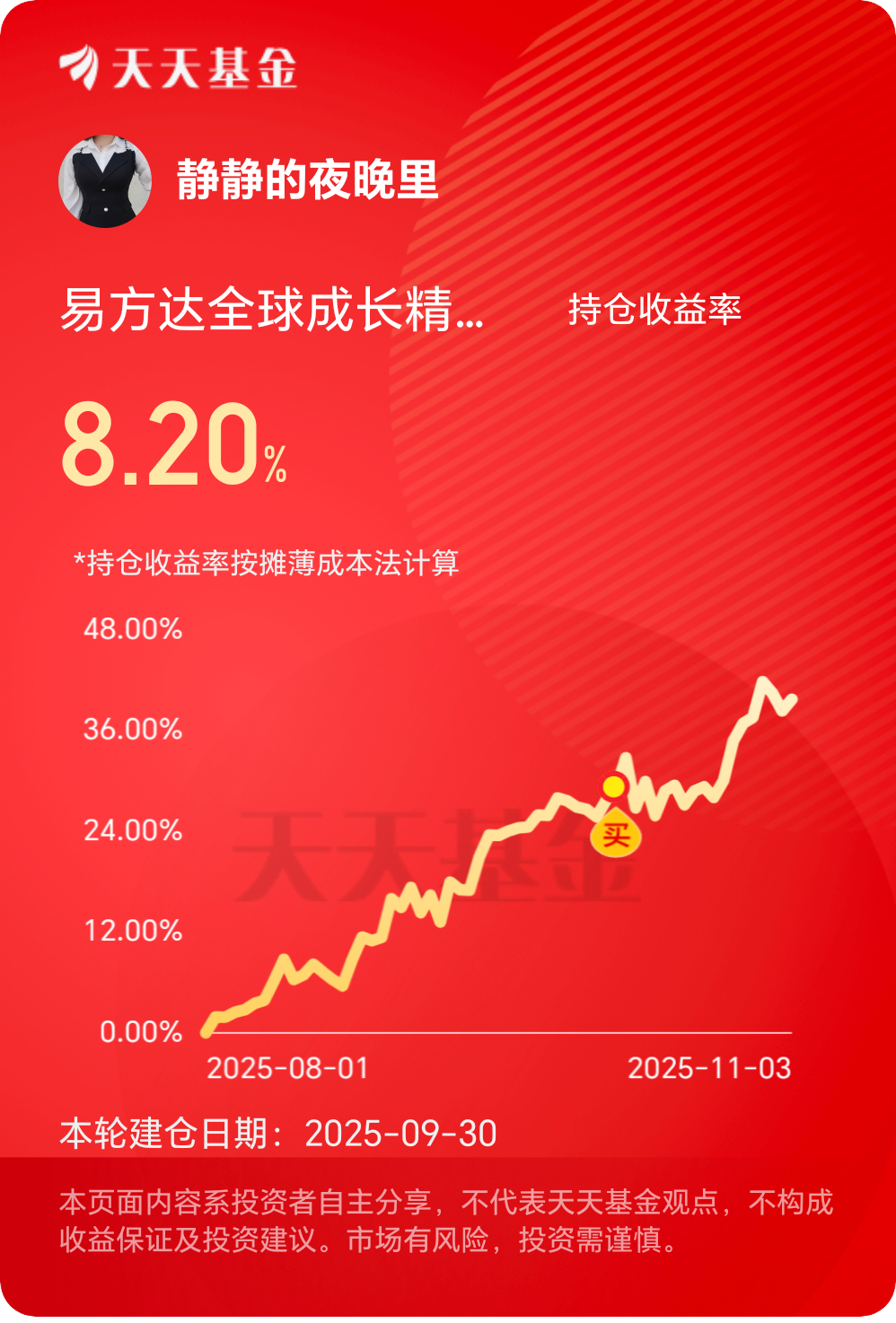 #晒收益# 近期全球科技市场都有所波动,但科技作为市场主线,长期趋势仍然向好,而我们只需把目光放的长远,就以我持仓的$易方达全球成长精选混合(QDII)人民币C$ 来说,自从持有之后,体验感就特别好,目前收益率也有8.2%,这款基金的持仓聚焦于全球科技龙头产业,近一年涨幅95.27%,让我无需操心调仓操作,安心拿稳拿住即可!
