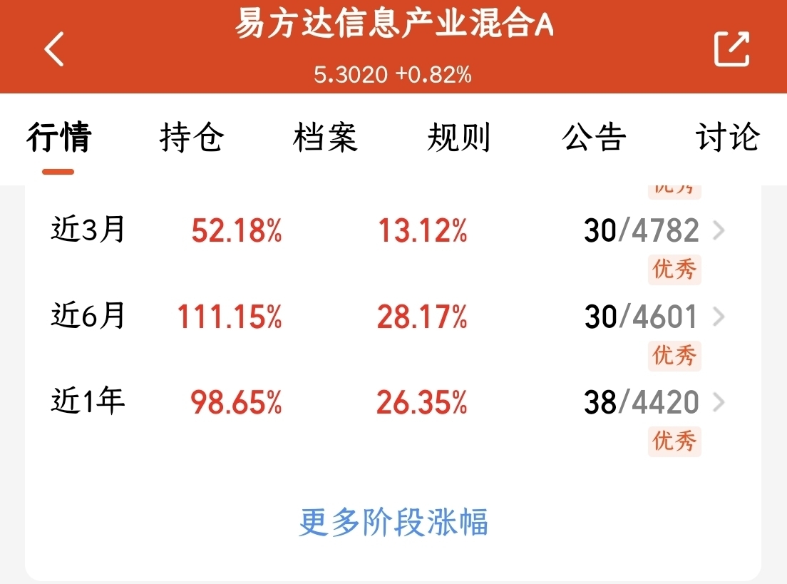 大家的热情太高了,$易方达全球成长精选混合(QDII)人民币C$ 近期限购了,不过大家可以关注基金经理另一只绩优的科技产品$易方达信息产业混合C$ 该基不仅额度充足,而且策略和全球精选也比较一致,表现也特别好。近半年涨幅52.18%,近一年涨幅111.15%。