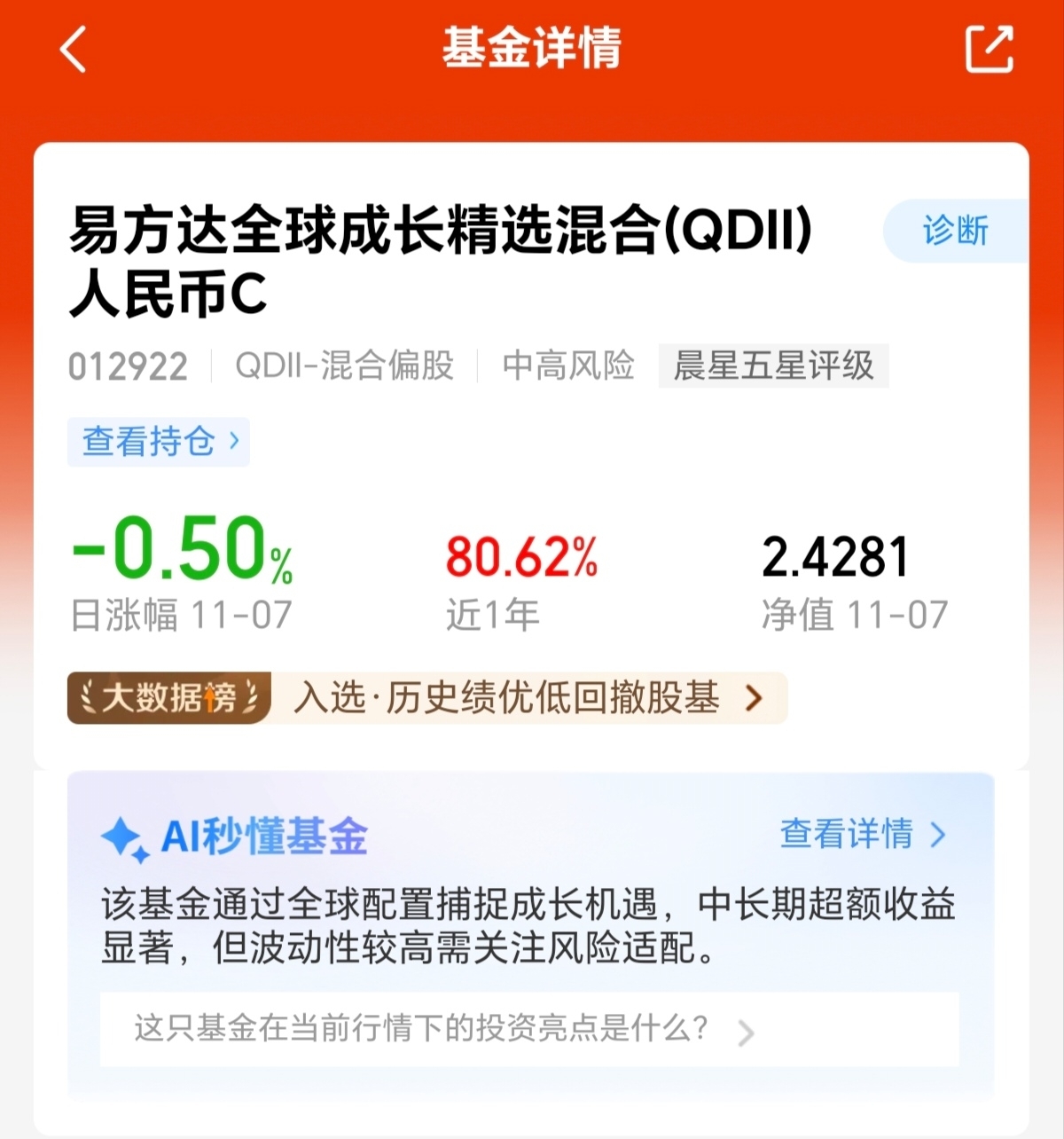 今日A股、港股行情有所震荡,好在隔夜美股继续强势大涨,不过在今年以来,全球科技市场都表现亮眼,所以有时回调也是机会,而我准备同时把握多个市场的科技机遇,其中$易方达全球成长精选混合(QDII)人民币C$ 投资策略刚好聚焦全球科技,近一年涨幅超80.62%,并且基金经理对全球市场有着敏锐的布局,从而获取超额收益显著,我选择定投起来啦!