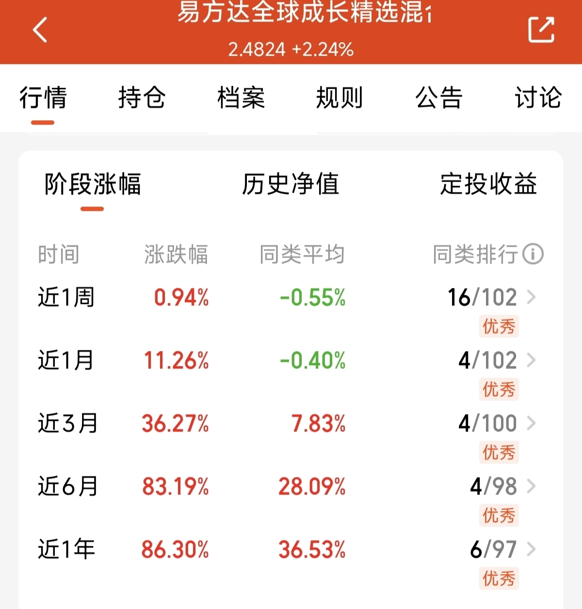 当前整体来看,全球市场科技的表现整体都非常不错。美股科技的表现确实一直比较强$易方达全球成长精选混合(QDII)人民币C$ 是聚焦全球科技的主动混合基金。基金经理通过投资a股,美股,港股多地来把握全球科技成长机会,昨天又大涨了2.2%。爆发力的表现是真的强。1月上涨11.26%。近一年涨幅86.3%。而且遇到波动稳定性也是不错。整体表现都是涨多跌少。我期待继续创新高。