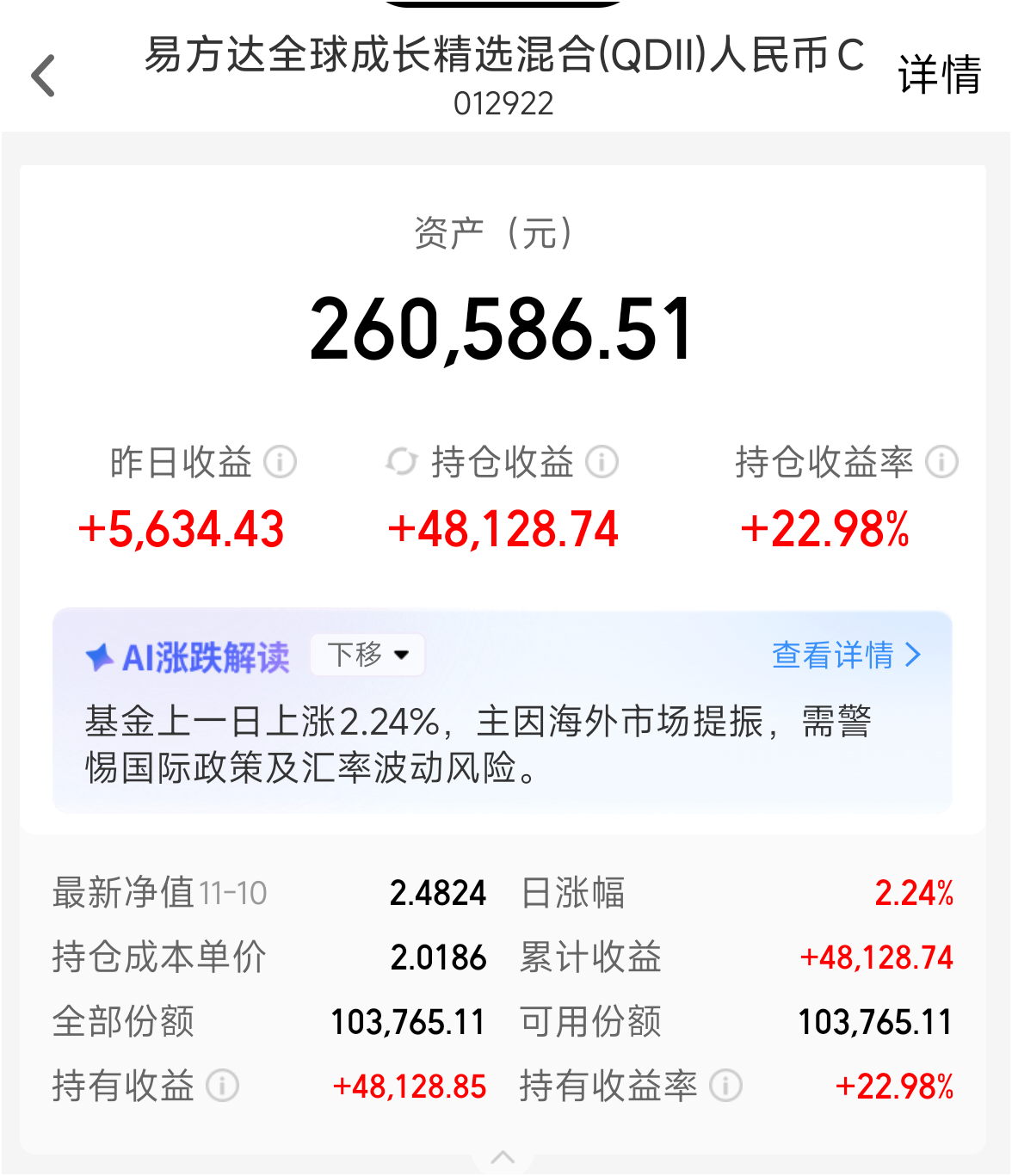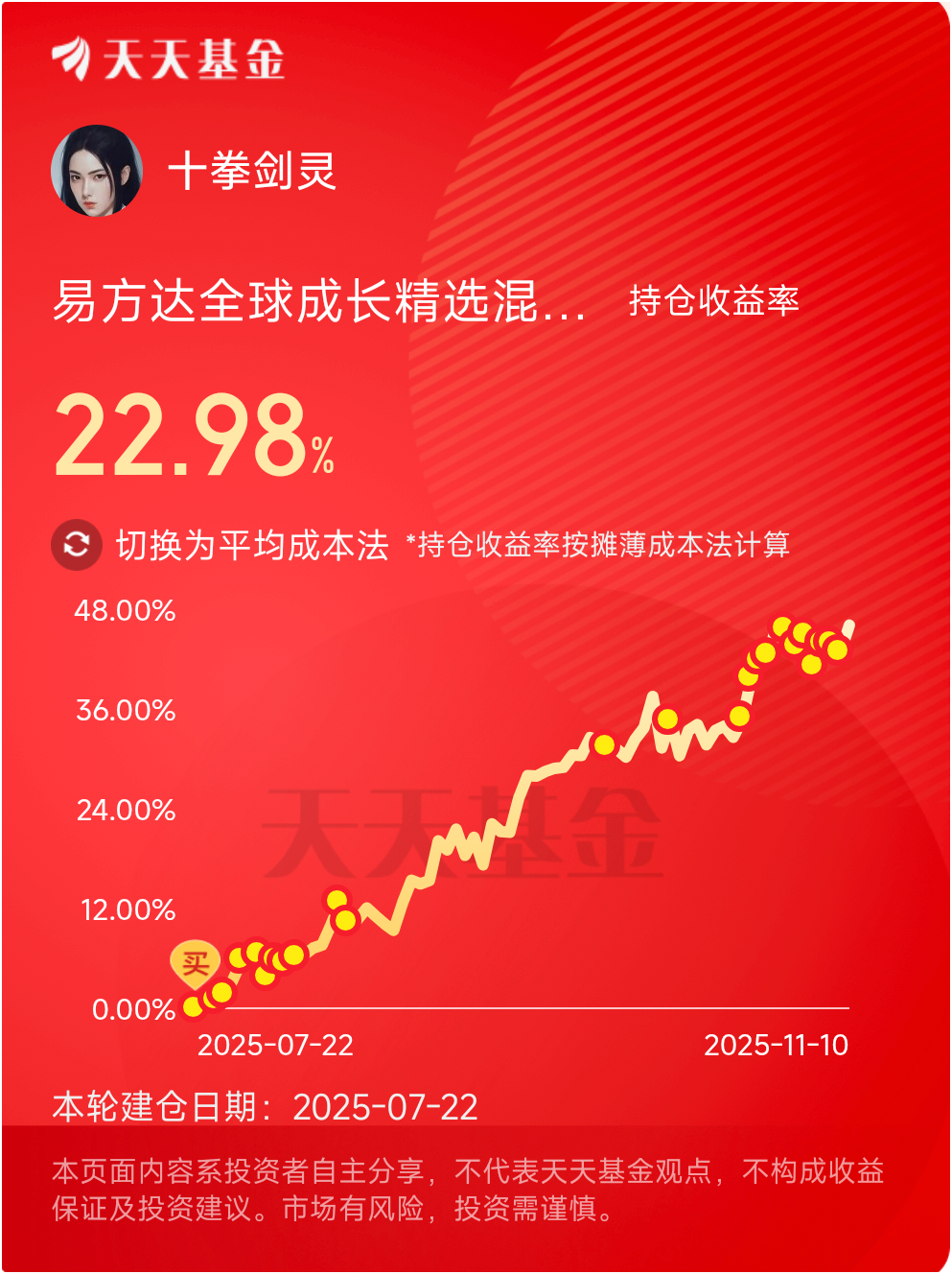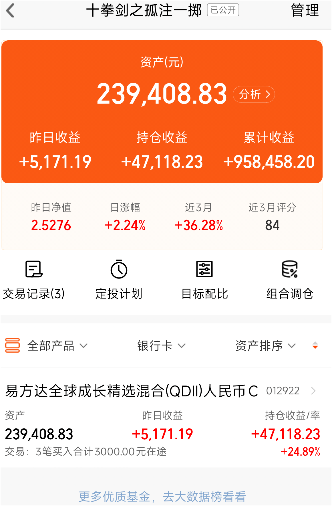 考虑到产品的灵活性、当下市场分格的适应性,我在十拳剑之孤注一掷组合中配置了100%的易方达全球成长,最新持仓市值23.6万元。