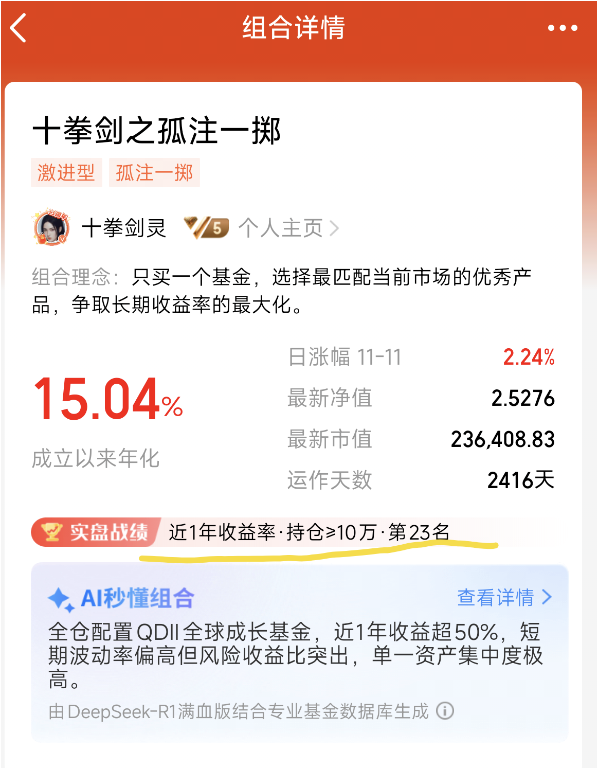 该组合近一年收益率在所有持仓10万以上的组合中,排名第23名,证明了该策略所选基金的弹性: