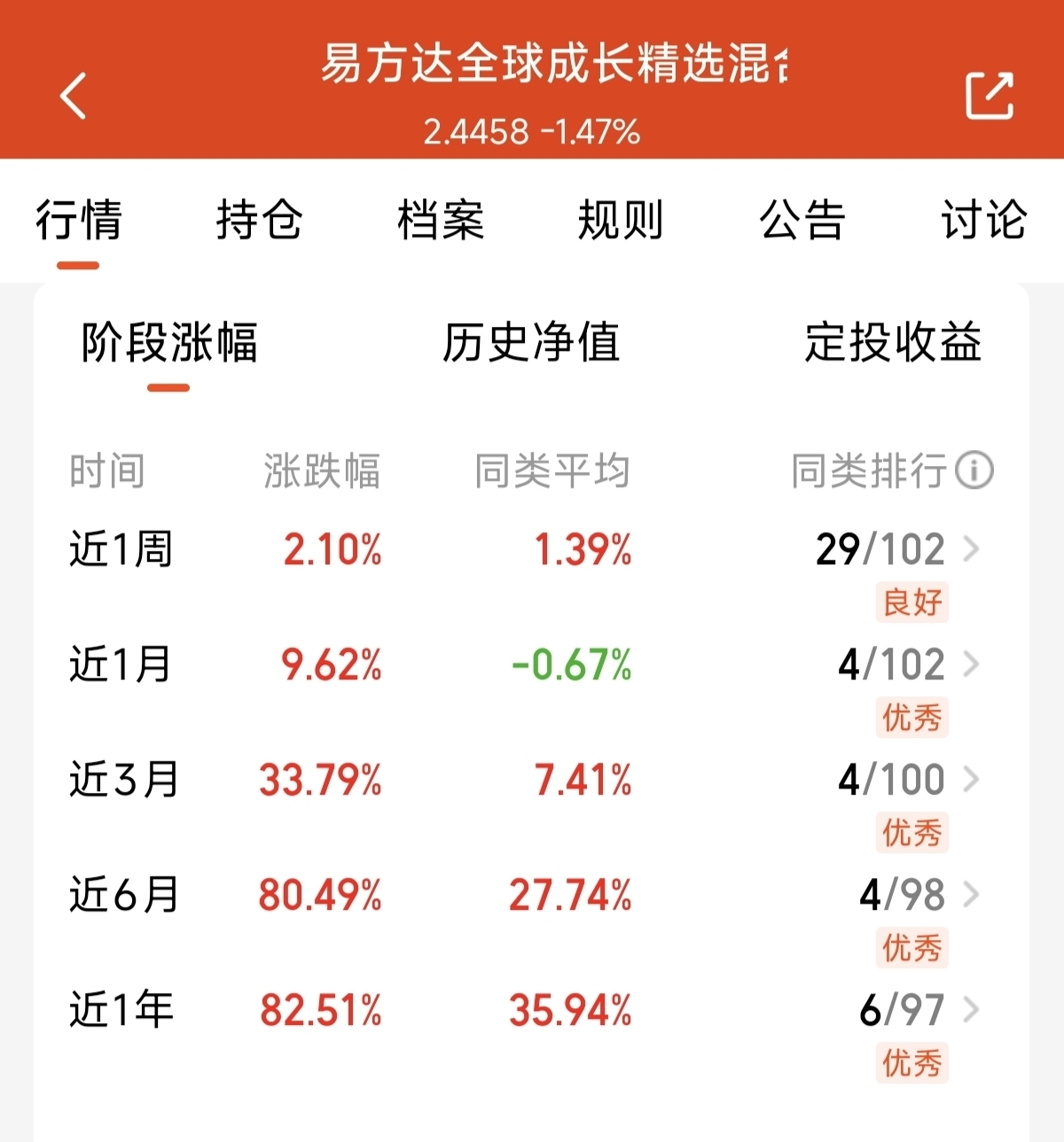 今天市场迎来了反弹。科技表现的还是不错。目前在全球市场来看,全球科技都是迎来爆发。$易方达全球成长精选混合(QDII)人民币C$ 是聚焦全球科技的主动混合基金。可以覆盖港股,a股,美股,多地科技。还可以规避单一市场风险。长期稳定的盈利能力强。近3月上涨了33.97%。近一年上涨了82.51%。都是稳定跑赢美股基金。我看好未来的稳定盈利表现。
