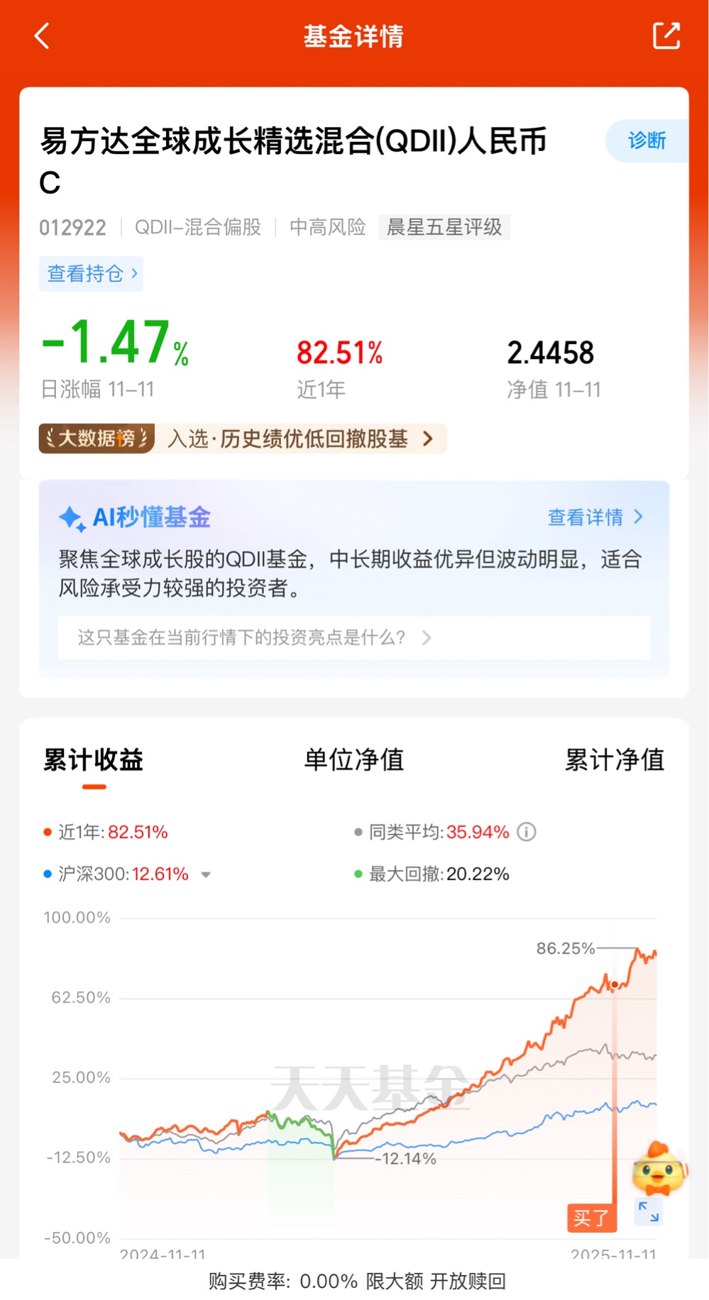 基金经理展现出卓越的调仓能力,从一季度重仓港股到二季度布局美股AI均精准把握节奏,在近期回调中有效控制回撤,业绩持续稳健。