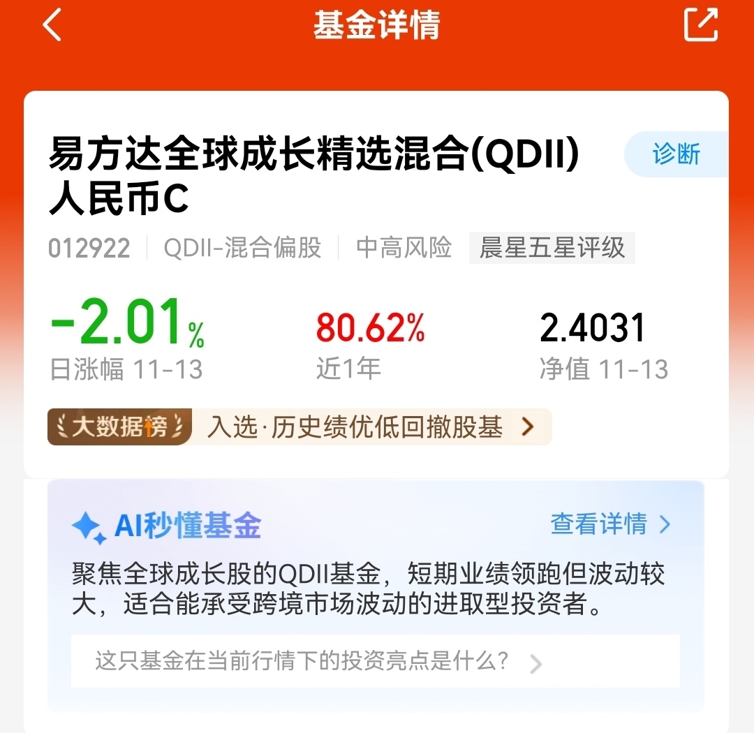近期市场行情呈现震荡回调趋势,其中科技类产品跌幅较多,也刚好释放了前期持续上涨的泡沫,所以我觉得回调也是机会,但有时单独看一个市场容易踏空,我会选择均衡持仓,$易方达全球成长精选混合(QDII)人民币C$ 全方位把握全球科技龙头,一键布局港股、A股、美股等核心科技赛道,基金经理特别擅长灵活操作,对市场行情有着精准的把握,我觉得跟着他很安心!