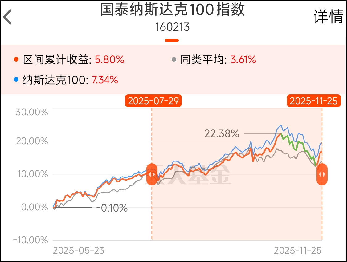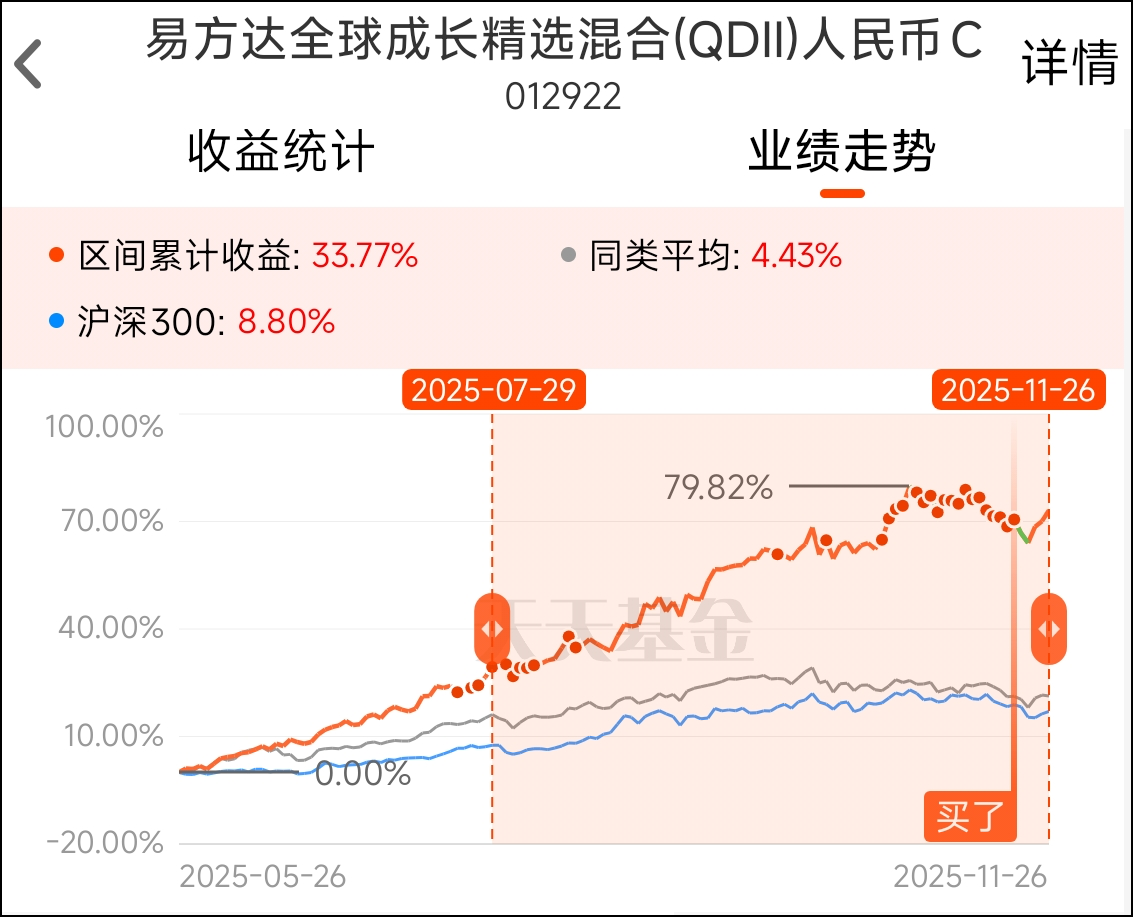4个月过去了,咱们通过天天基金的区间查看功能对比下吧。可以看到这段时间里,易方达全球成长收益率33.77%,纳斯达克指数收益率5.8%左右,4个月产生了28%左右的超额收益。