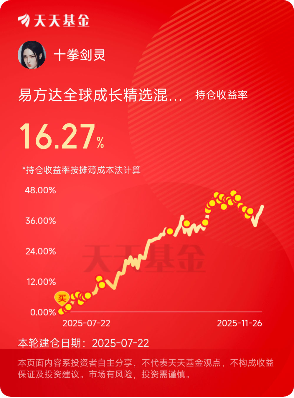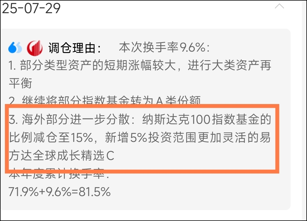 今年7月底的时候,咱们的十拳剑灵活配置投顾将5%的纳斯达克指数转入了$易方达全球成长精选混合(QDII)人民币C$ 。十拳剑超稳星组合也把1%的纳斯达克指数转了进去。当时易方达全球成长基本不限购,抓住机会完成了大额建仓。