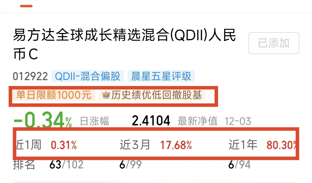随着美联储12月降息预期直线升温,昨夜的美股科技再次迎来连续上涨。当前我依然看好美股科技的成长表现。$易方达全球成长精选混合(QDII)人民币C$ 这只聚焦全球科技的主动混合基金。通过投资a股,港股,美股多地来把握全球科技机会,主要聚焦美股科技,近一周上涨了0.31%。近一年涨幅80.3%,而且遇到波动回撤控制的好。可以规避单一市场波动的风险。我看好四季度继续创新高。