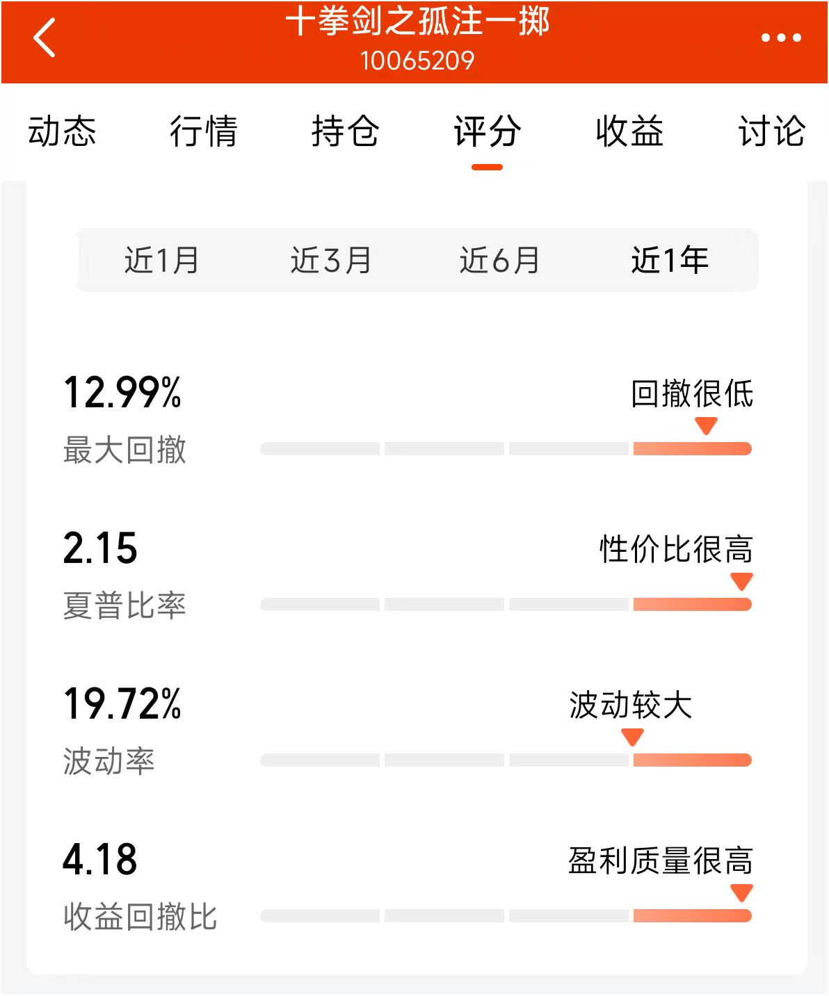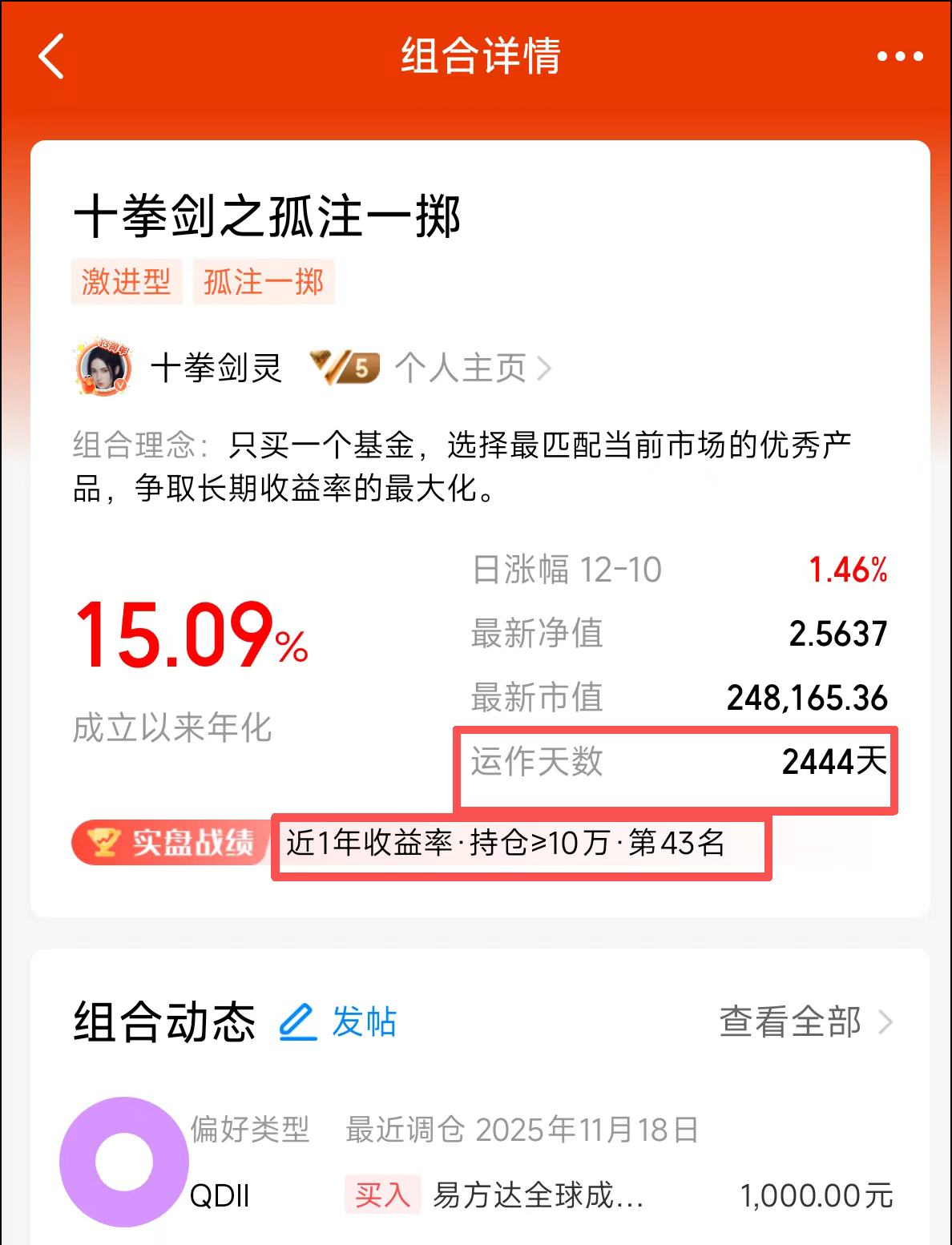 最后,再看看这个孤注一掷组合的一些战绩。运作天数已经有2000多天,穿越了很多黑天鹅事件。近一年收益率在持仓≥10万的所有组合中排名第43名。