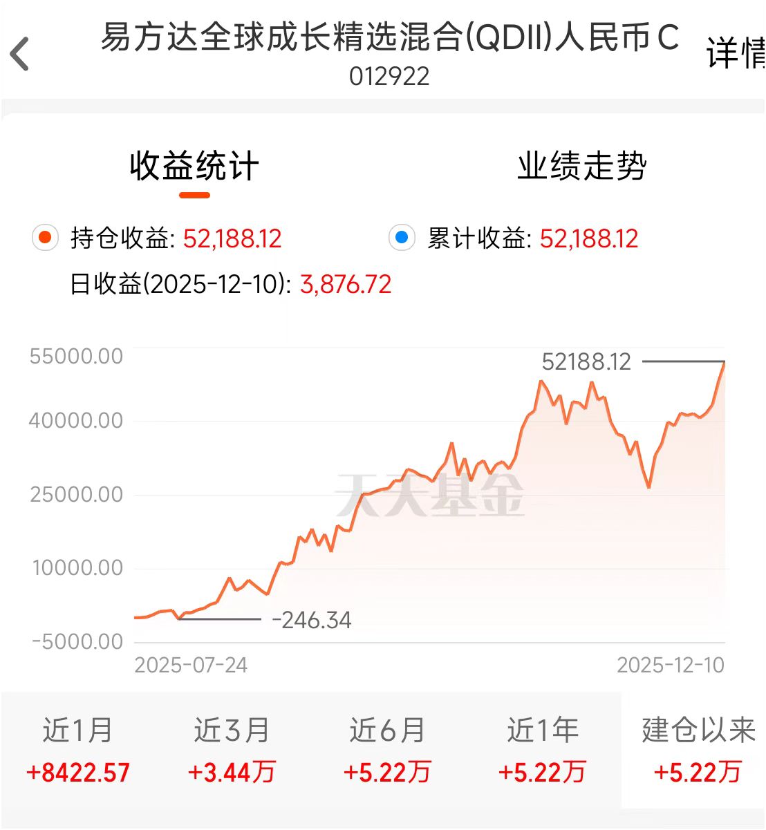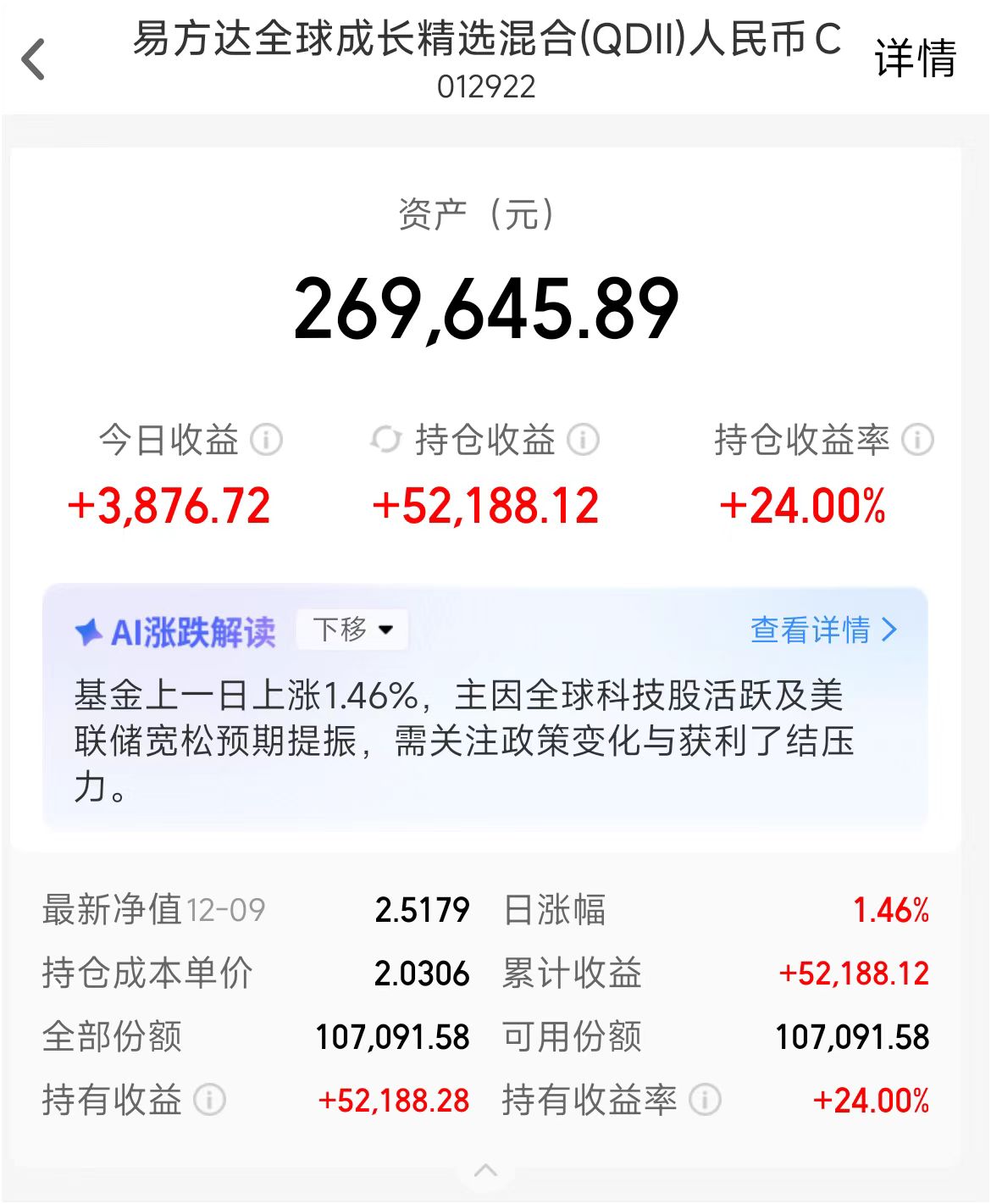 组合中的 $易方达全球成长精选混合(QDII)人民币C(OTCFUND|012922)$,一天给送了小四千块进来。数字跳一下,心里跟着动一下,但也就一下。然后该干嘛干嘛。
