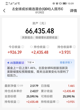 2.美股科技:我从十月以来一直坚持布局全球科技方向,先是坚持每天加仓1万元$易方达全球成长精选混合(QDII)人民币C(OTCFUND|012922)$。后面因为日限额1000元了,所以就我就改成了日定投1000元。今天我也继续执行了定投计划。截止目前,我已经持有这支基金66435.48元,在不知不觉中也已经收益了2435.48元,真是太开心了。