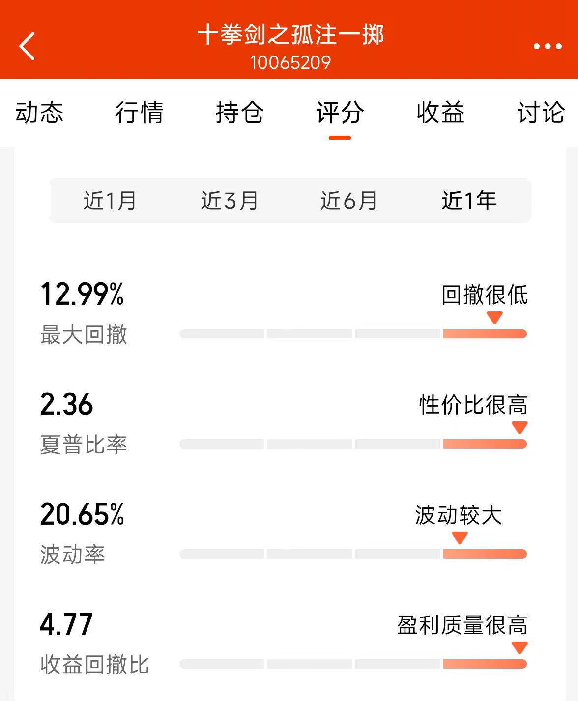 近期状态还行:目前规模大概25.7万,系统评分给的几个专业指标(我解释下:夏普比率高代表“性价比”好,收益回撤比高说明“盈利质量高”)都很好看。不过话说回来,这只能代表过去一段,不代表未来哈。