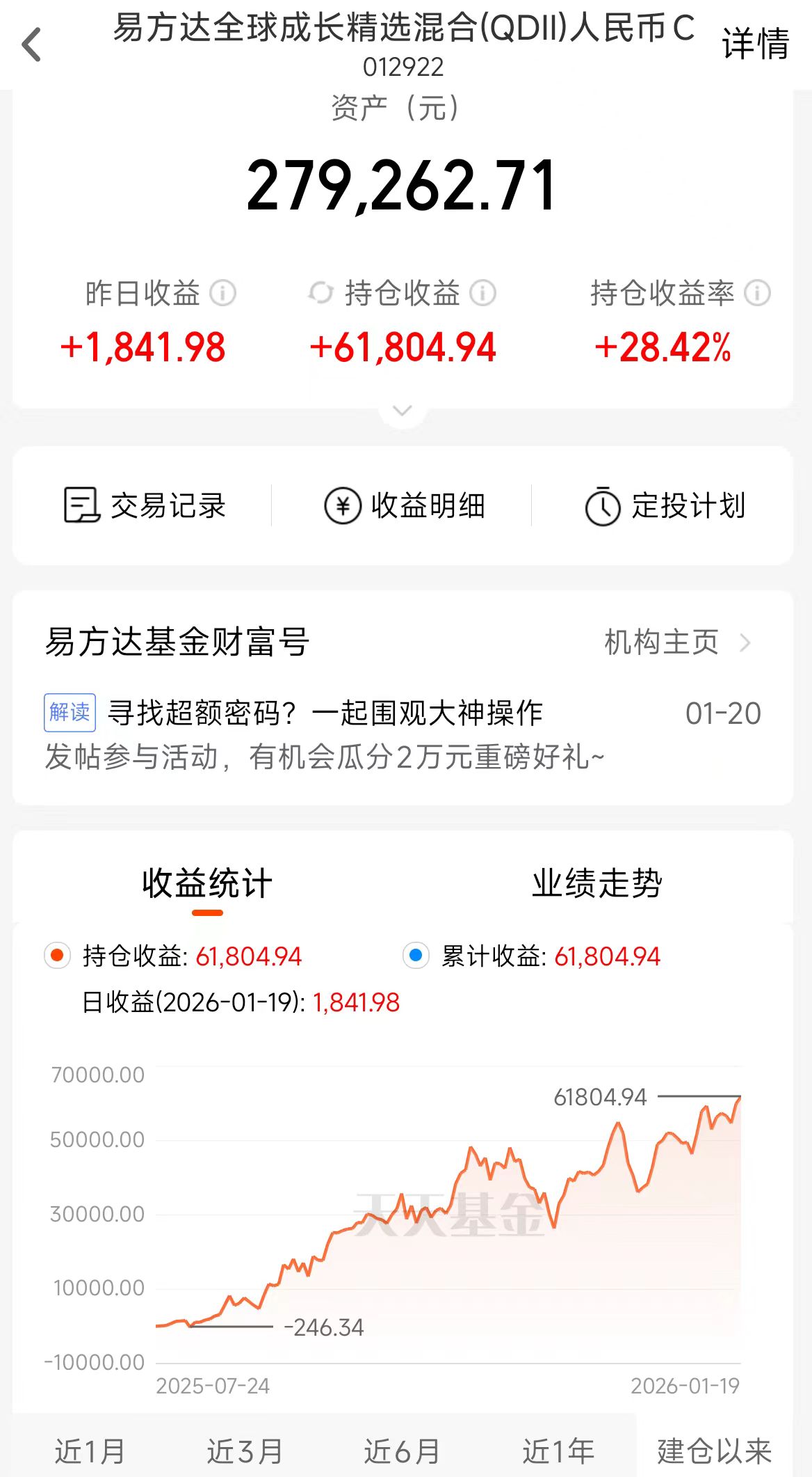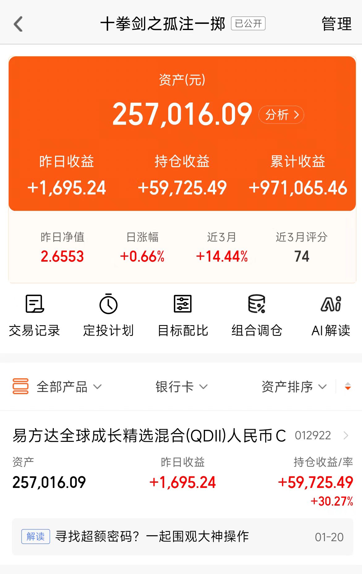 这组合,听名字你们也懂,就是“把所有鸡蛋放在一个篮子里”的那种。好多朋友第一次看到都惊了:“你就只持有一只基金?!” 没错,就这么极端。