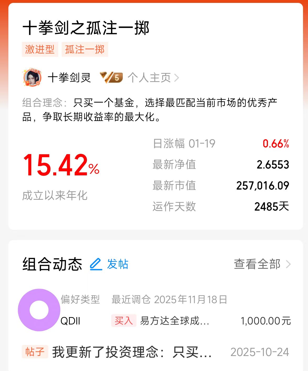 哎,真快啊。 一转眼,我在天天基金上捣鼓的那个激进型公开实盘组合——「十拳剑之孤注一掷」,已经吭哧吭哧跑了2485天,接近7年了。期间经历了多轮的牛熊,年化15.42%