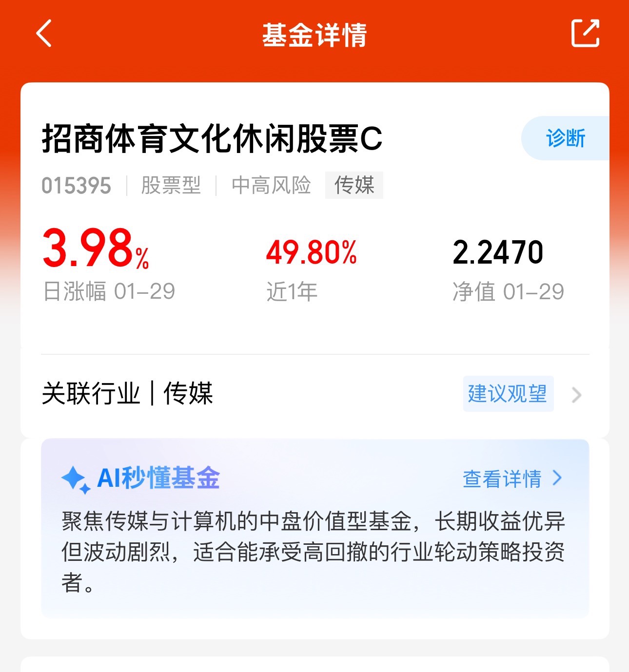 今天三大指数探底回升走得挺稳,创业板指直接涨超1个点,科技板块依旧支棱!昨天反弹的AI应用方向下午也企稳了,$招商体育文化休闲股票C$ 太跟节奏了,昨天涨3.98%,重点布局AI应用软件、传媒这些方向,爆发力超足,近一年涨了49.8%。现在板块看着要企稳反弹,这只基长期收益稳,我特别看好!