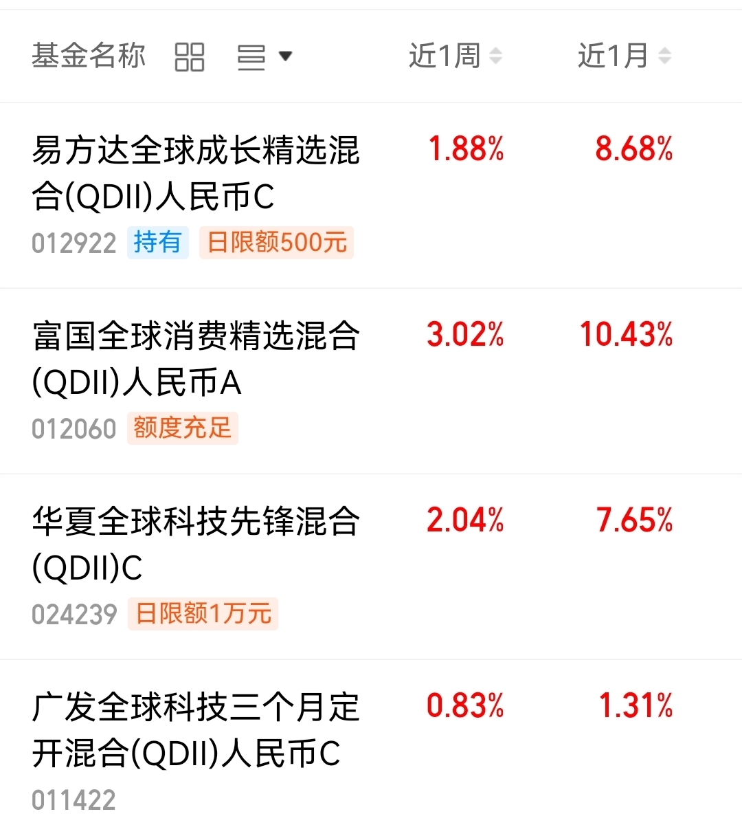 不依赖单一市场,全球布局,不止风险分散,还可网罗全球优质企业。持仓的$易方达全球成长精选混合(QDII)人民币C$ 收益率高达10%+。最近科技有一定回撤,但这只对回撤控制得还不错,中长期收益也是领涨同类。