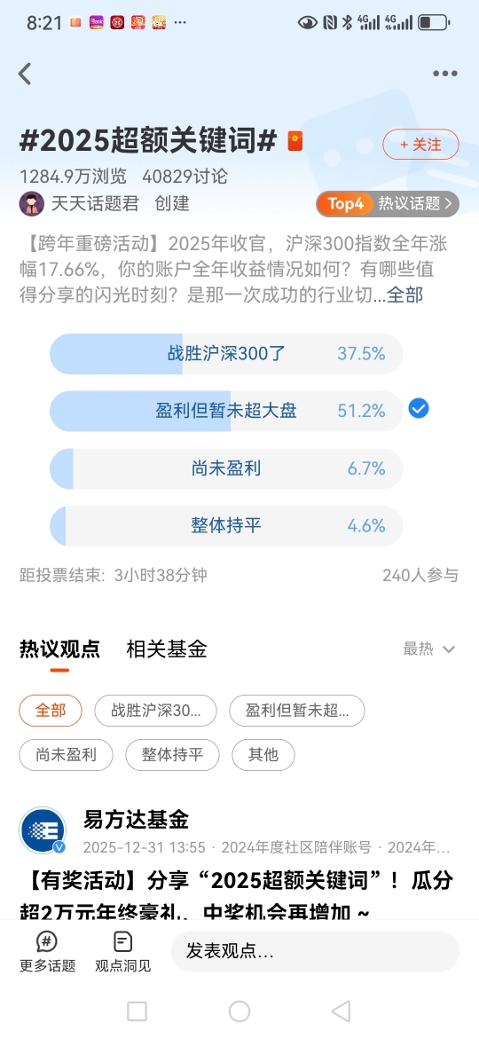 我选择了“盈利但暂未超大盘”,2025年,我的收益情况是没有跑赢沪深三百,我的超