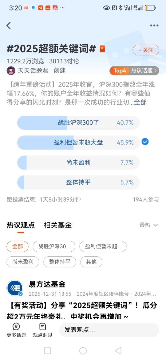 我选择了“盈利但暂未超大盘”,2025年,我的收益情况是没有跑赢沪深三百,我的超