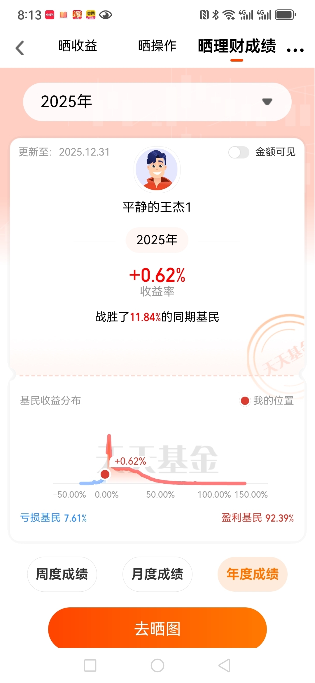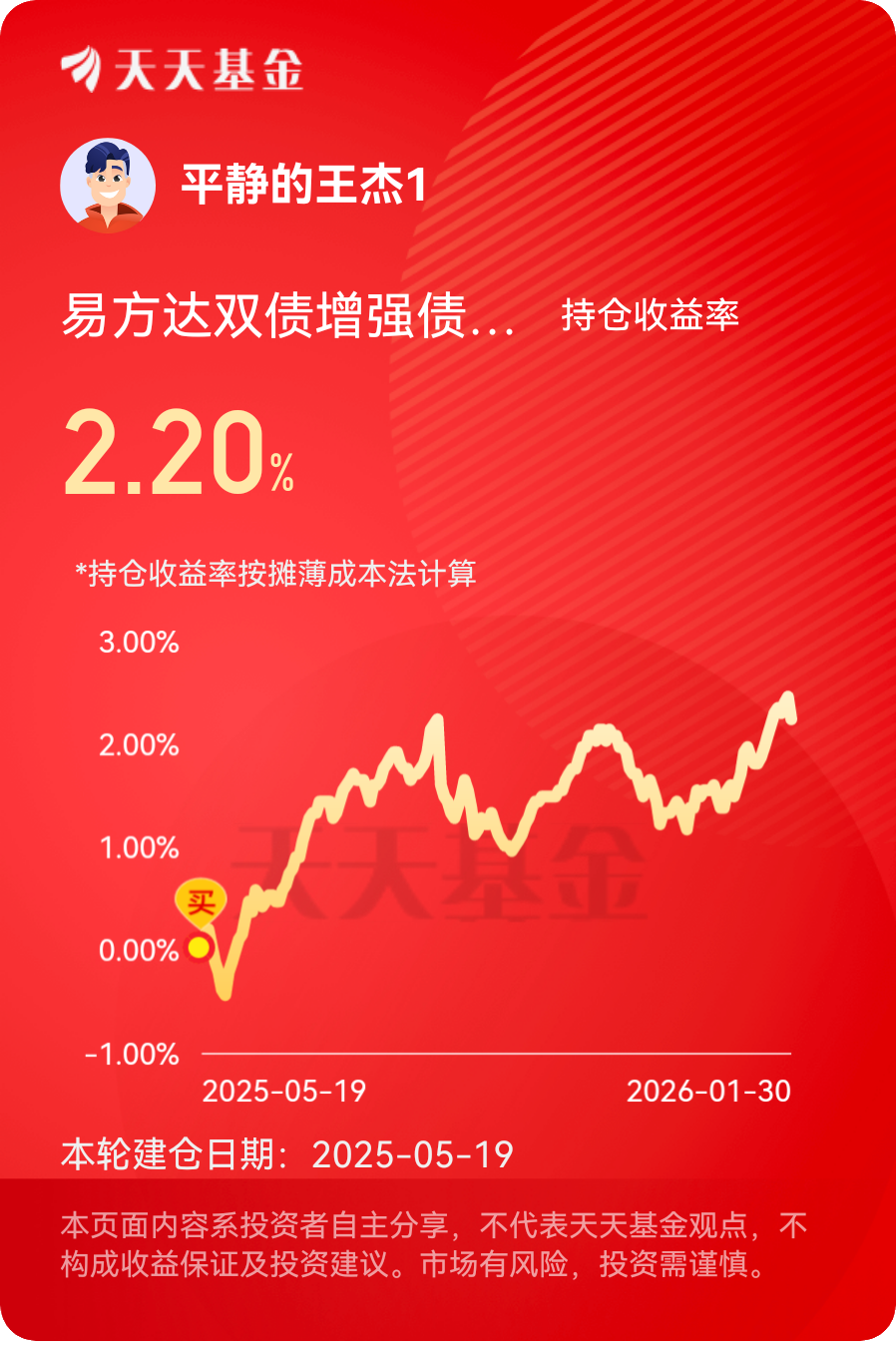 #2025超额关键词# 2025年我的收益情况是没有跑赢沪深三百,我的超额关键词是忍耐。2025年收益为0.67个百分点,微红,收益不是很理想,可能是重仓了债基的原因,不过2025已经过去,让我们一起期待2026吧。#晒收益#