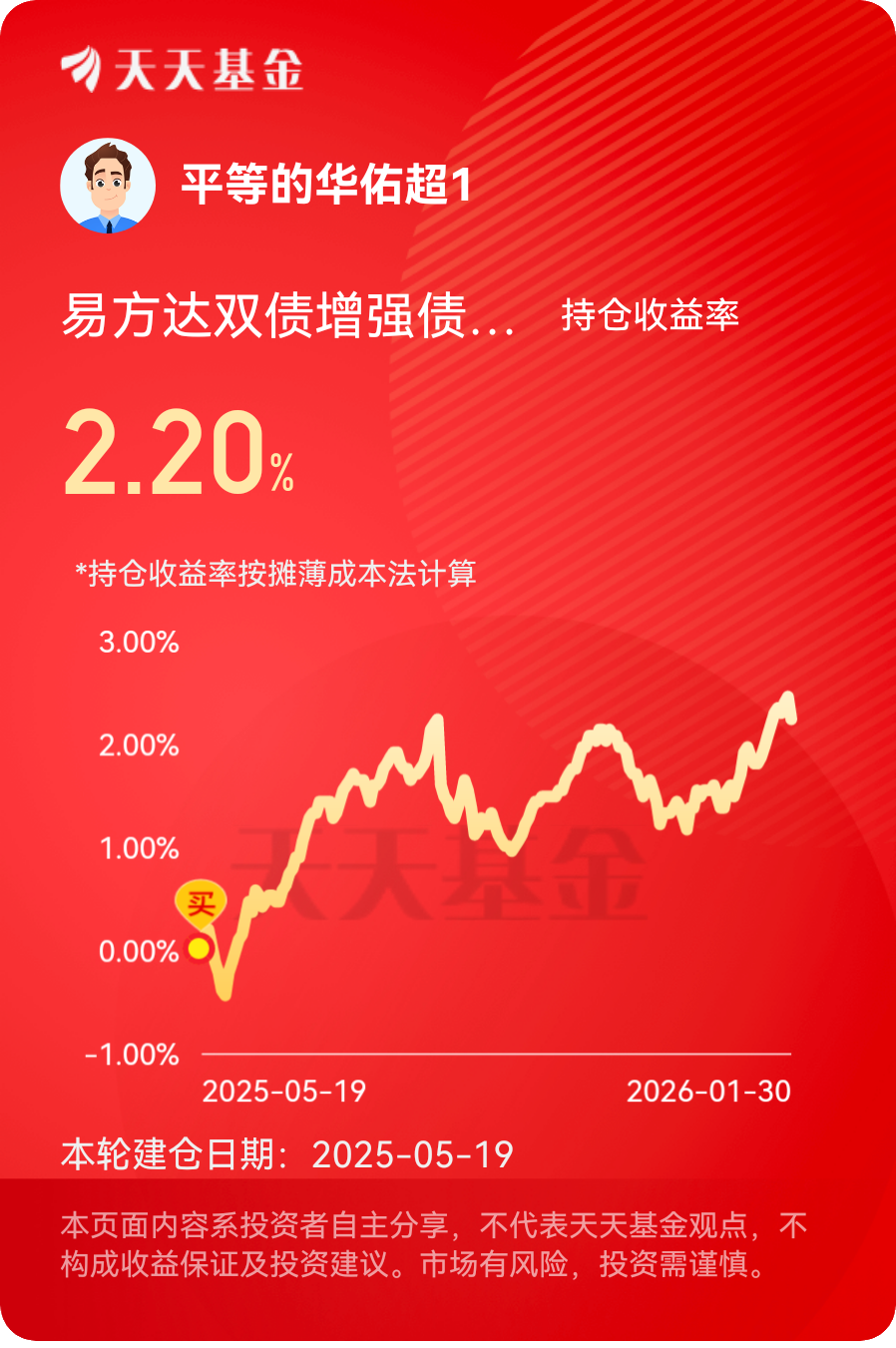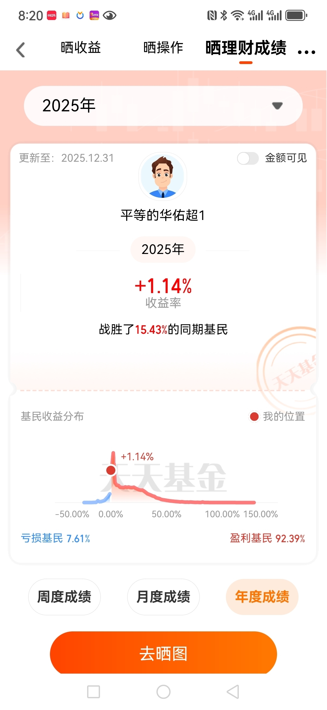 2025能收益是1.14%,没有跑赢大盘,不过不要紧,投资要有耐心,求稳还是很重要的,要不赚多少钱都会还回去的,期待2026能能有好的收益吧!#晒收益#
