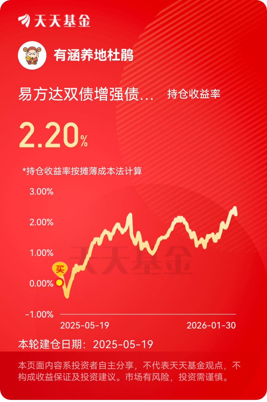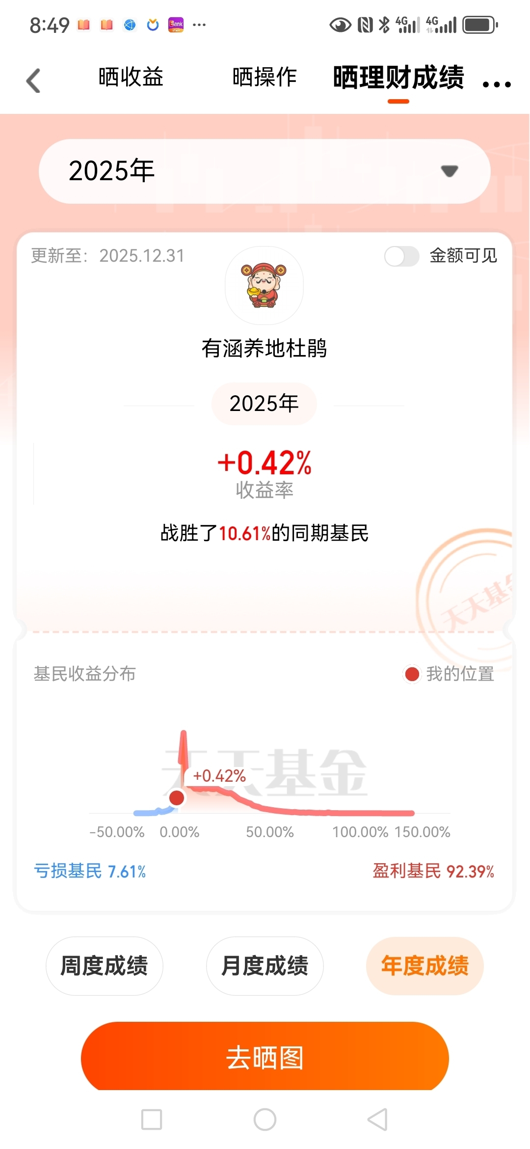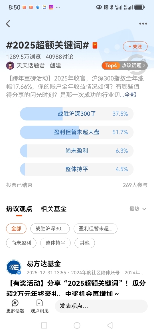 #2025超额关键词#2025年,我的收益情况是没有跑赢沪深三百,我的超额关键词是戒骄戒躁。去年收益为0.42个百分点,非常不理想,看来需要认真总结一下了。不过投资不能急躁,不能因为去年收益不好就着急,还是要有耐心,按照计划来,才能获得好的收益。#晒收益#