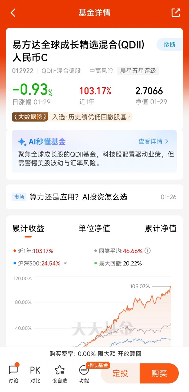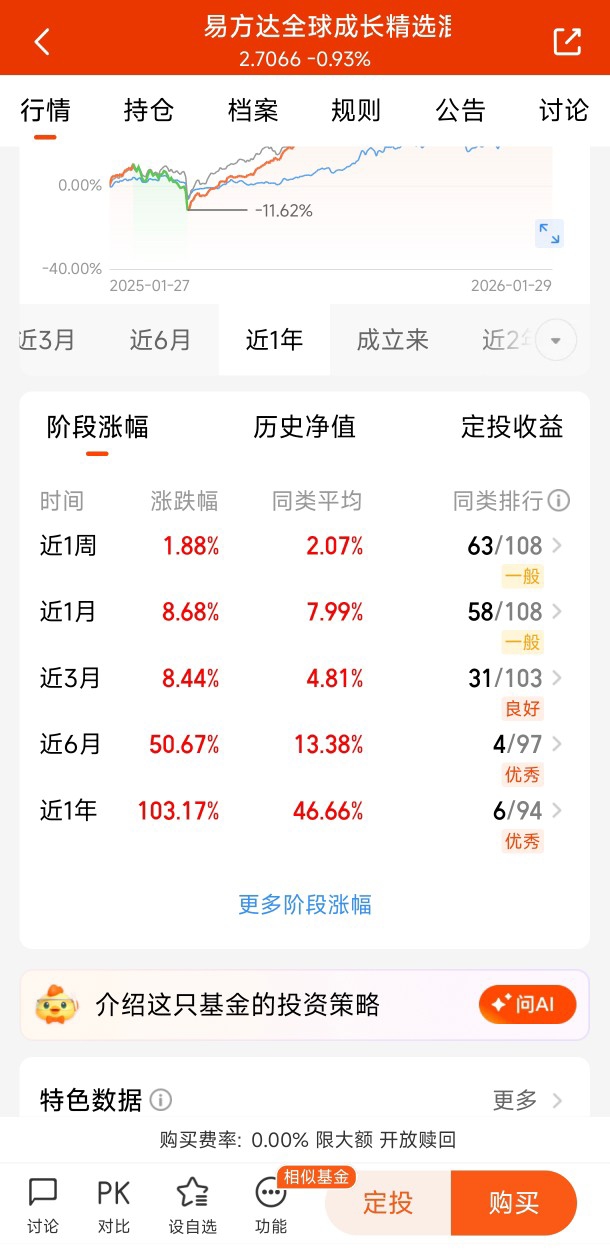 回头看易方达全球成长精选混合基金的走势,会发现一个令人深思的现象:该基金在2025年初至2026年1月期间,虽然也有波动,但但长期持有者获得了远超市场的回报。如果我能够坚持长期投资理念,不因短期波动而频繁操作,收益情况将截然不同。