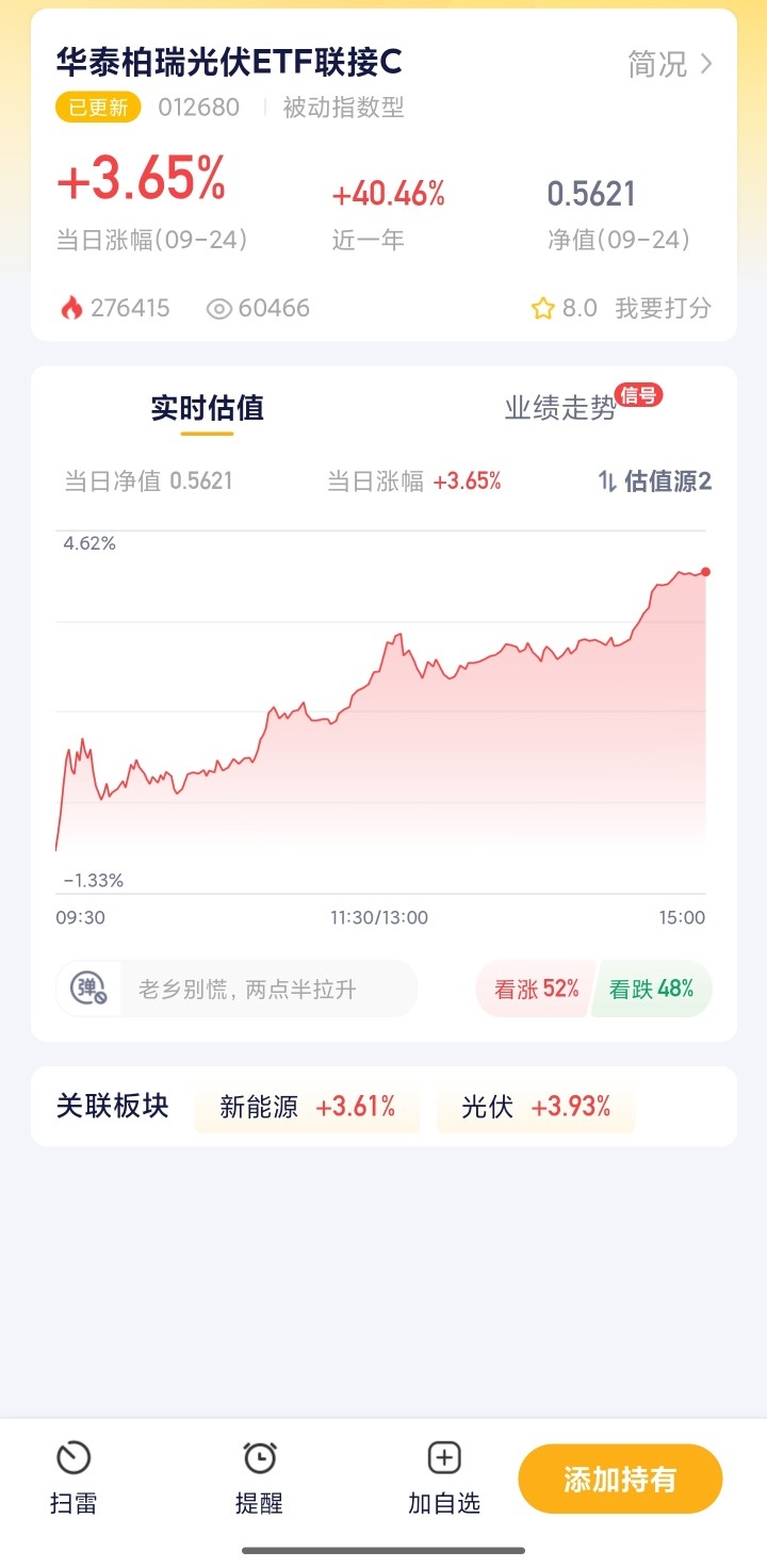 这波行情是真有支撑,多晶硅价格在反弹,产业链盈利在恢复,海外像印度还降了税,咱们的光伏产品出海更有优势了。想跟上但怕选错股的,华泰柏瑞的基金值得看。它近期跟板块的同步性特别高,前几天板块大涨时单日涨幅就超6%,能精准捕捉行情。而且它是打包布局,能降低单只股票的风险。但得记着,高弹性伴随高风险,得理性对待,别盲目追高。#光伏领涨!调整结束了?# $华泰柏瑞光伏ETF联接C$