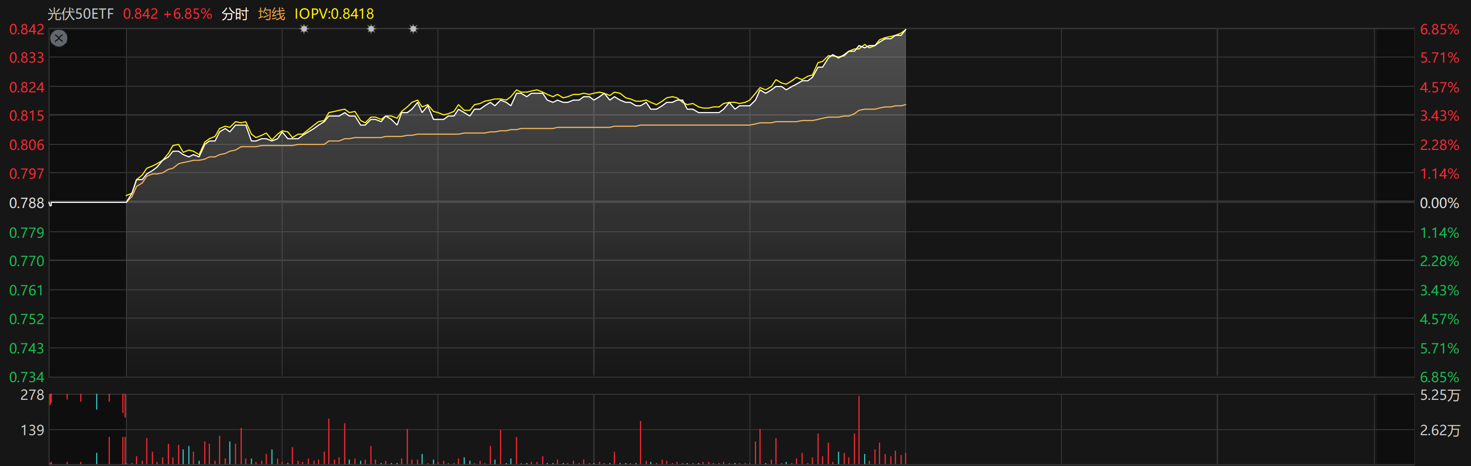 光伏板块今日成为市场最耀眼的明星。当前光伏50ETF(516880)盘中涨幅超过6%,成分股中阿特斯暴涨超12%,阳光电源、隆基绿能、特变电工涨幅均超8%。这一轮上涨并非孤立事件,从4月9日的年内低点计算,光伏板块累计涨幅更是达到45%,明显跑赢大盘。今天A股市场光伏板块的强势表现令人瞩目。在三大指数小幅震荡的背景下,光伏板块逆势走强,成为低迷市场中的一抹亮色。千亿市值龙头隆基绿能早盘直线拉升涨停,股价创出年内新高,同时晶澳科技、京运通、晶科能源等多只个股同样涨停。
