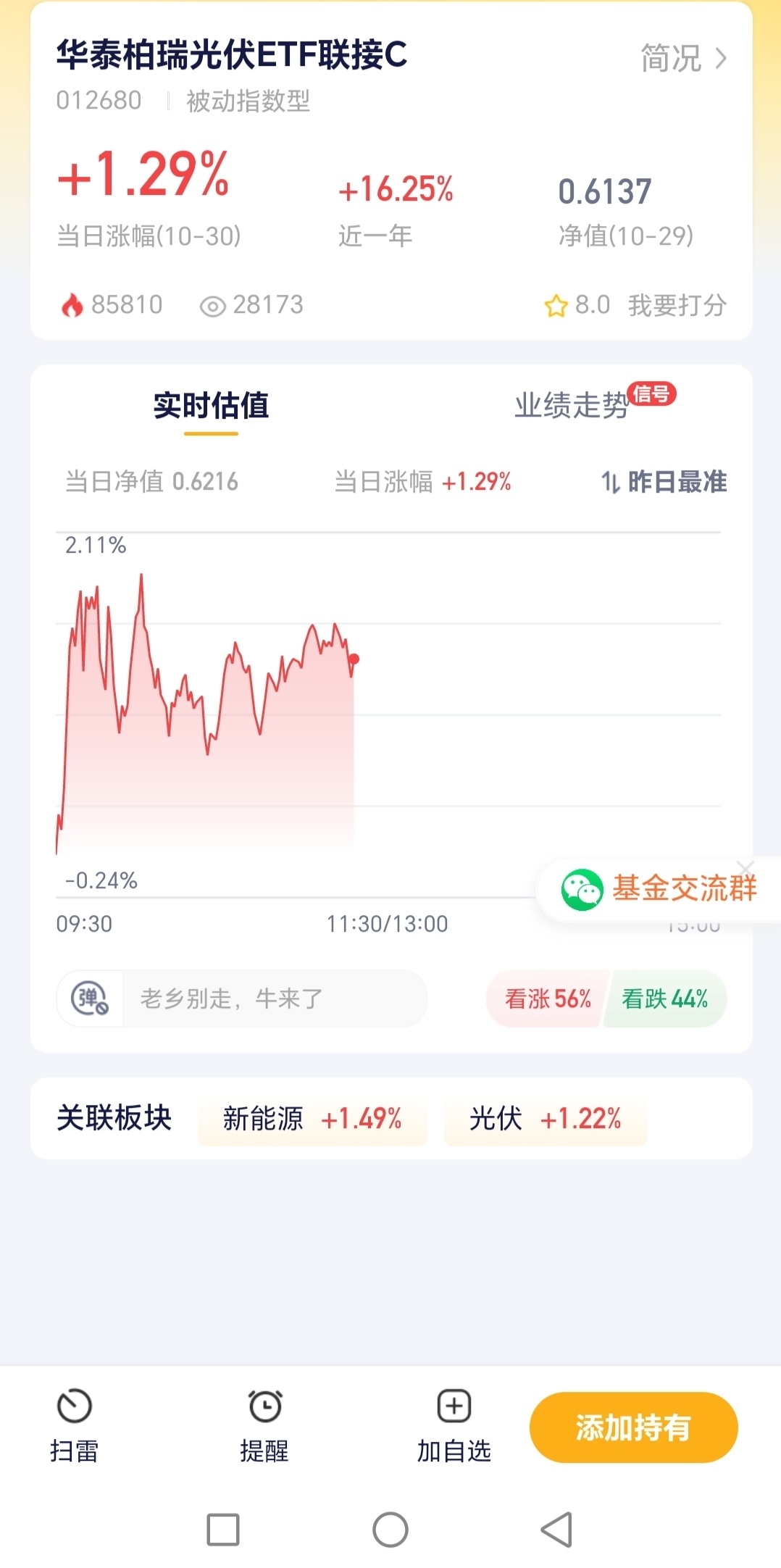 光伏今天又涨了1.22%,行情这么好,不参与一下都觉得亏!华泰柏瑞今天也涨了1.29%,近一年更是涨了16.25%。这只基是跟着光伏指数走的,简单来说就是光伏板块涨它就跟着涨,特别适合那些觉得光伏有前景,但又不想花时间研究个股的朋友,想在光伏里分杯羹的,不妨看看它~#飞天茅台批发价跌破1700!酒价何时触底?#