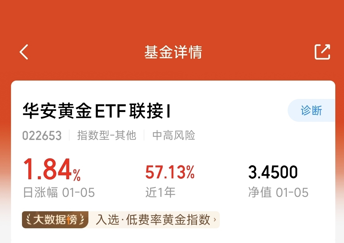 对比过好多黄金基,还是$华安黄金ETF联接I$ 香!近一年涨57%+,费率最低,7天免赎,细节拉满赢麻了