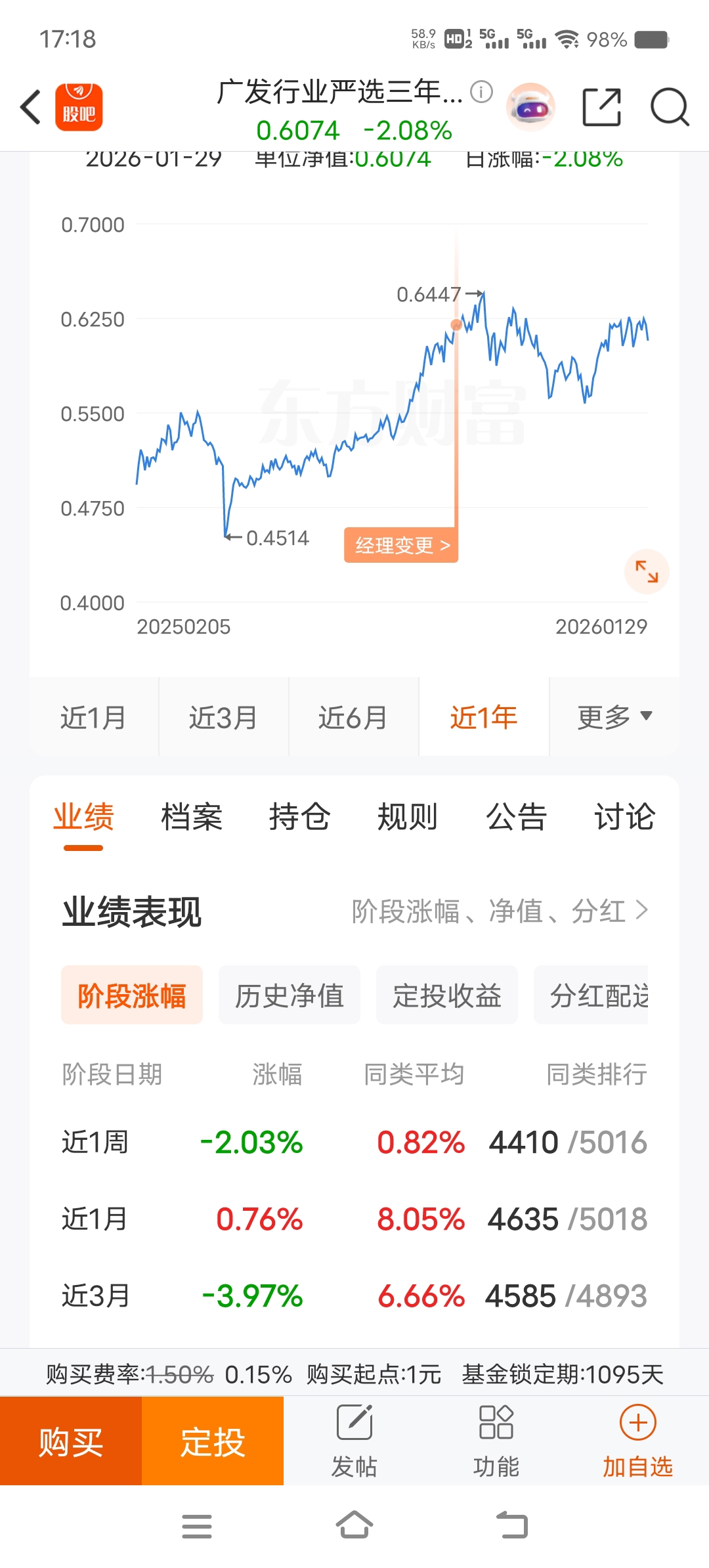 $广发行业严选三年持有期混合A(OTCFUND|012967)$ 今天看还红了两个多点,不过离我回本还有距离
