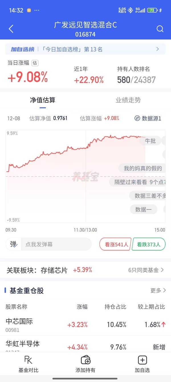 专门对比了一下,今天存储芯片板块平均涨5.8%,广发远见智选C干到9%!同样的风口,弹性差这么多,看来基金经理调仓选股确实有东西。弹性即王道,要买就买跑最快的$广发远见智选混合C$