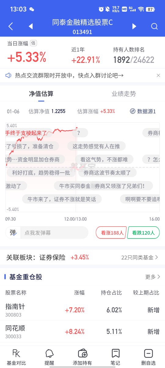 券商板块成为 A 股涨势先锋,赚钱效应持续释放!同泰金融精选聚焦券商核心标的,今日估值超 5 个点,用专注抵御市场波动。布局券商赛道,金融精选是靠谱之选~$同泰金融精选股票C$