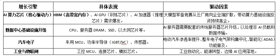 特别需要指出的是内存市场的强劲复苏:WSTS数据显示,DRAM市场预计2025年增长高达49%,成为增长最快的品类。这直接反映了AI服务器对高带宽、大容量内存的迫切需求。