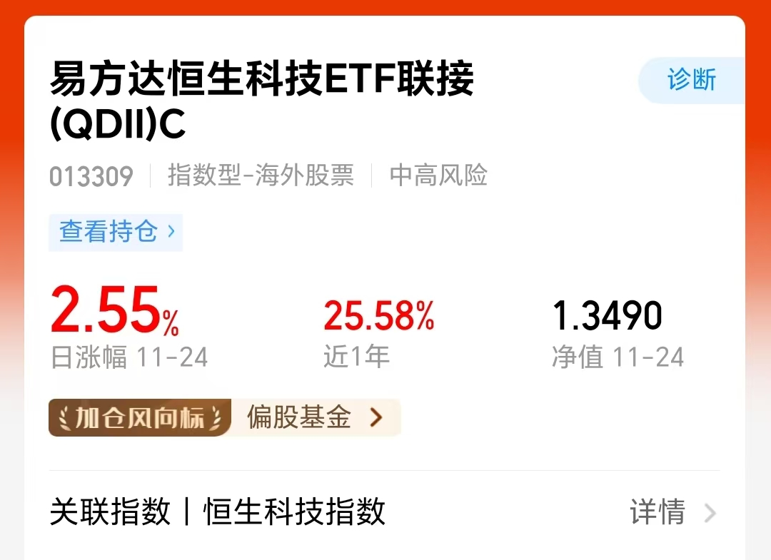 我一直拿着易方达恒生科技C近一年业绩涨幅25.58%还不错。恒科的底层都是优质互联网公司,目前指数虽然连涨2天了,但上方压力还较大,我还是老规矩:大跌多加、小跌小加,逢低布局的思路不变,布局下一轮反弹!