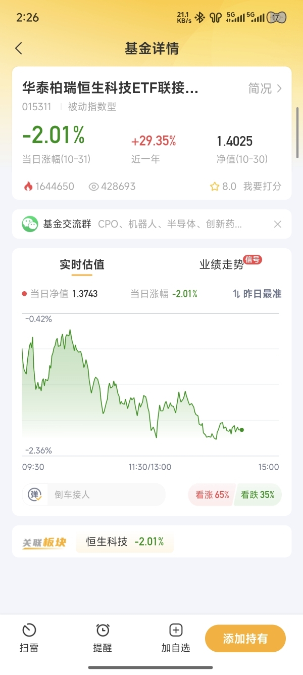 今天恒生科技板块跌了2.01%,华泰柏瑞的恒生科技联接基也跌了2.01%。但咱们