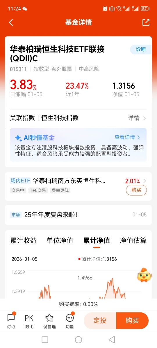 今天恒生科技板块的行情真的给劲,板块整体往上冲,里面的龙头股更是带头大涨,港股科技的春天好像真的要来了。华泰柏瑞涨幅3.83%,近一年也有23.47%的收益,它就是盯着恒生科技指数来的,板块的涨跌它都能精准跟上。要知道恒生科技板块聚集了很多互联网和科技硬科技企业,现在板块情绪回暖,对于风险承受能力较强的投资者来说,选华泰柏瑞这款基金布局港股科技,比自己买港股个股方便多了,还能避免单一个股的波动风险。$华泰柏瑞恒生科技ETF联接(QDII)C$ #2025年 你的投资战绩如何?#