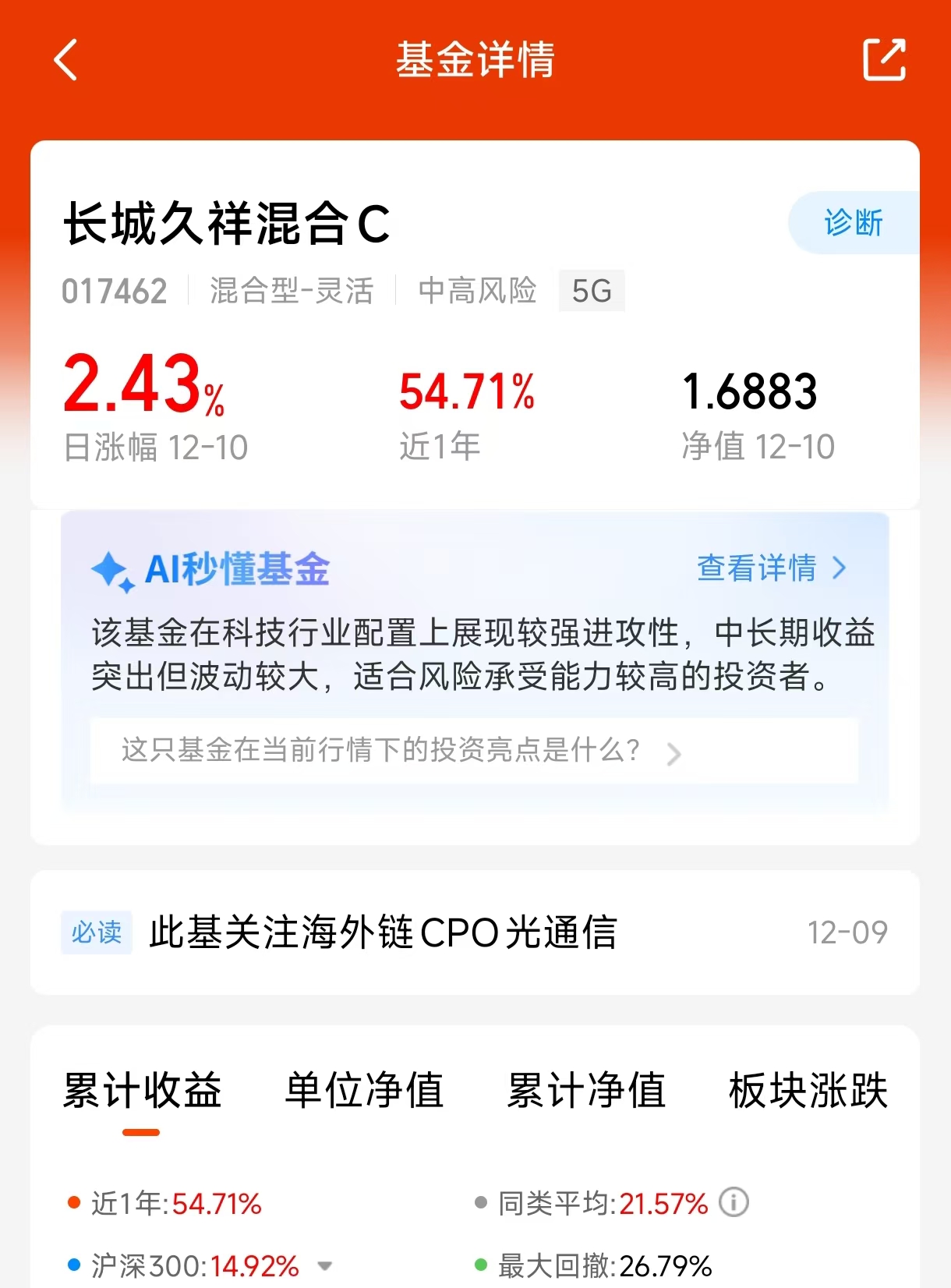 现在算力板块里,光模块的确定性几乎最高,$长城久祥混合C$(017462)本周表现亮眼,今天单日涨了2.43%,规模小就是灵活,容易做出锐度和差异性。我仔细对比过同类主动权益基金,像永赢、中航那些老牌产品当然稳健,但持仓覆盖面广,进攻弹性可能不如它。从技术走势看,趋势很强,均线多头排列,量能也健康。操作上,对于这种强势品种,我不建议一把梭哈,但绝对值得你加入自选重点观察。可在大盘整体调整或它本身回踩重要均线时,分批吸纳#摩尔线程市值超3300亿!估值逻辑是什么?#