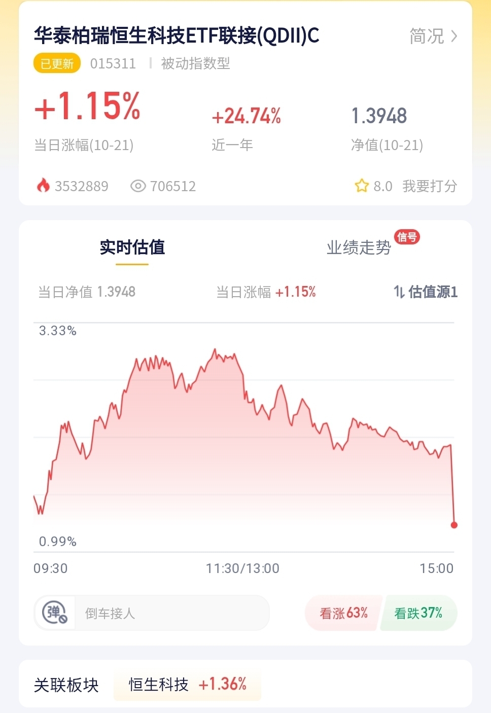 恒生科技今天太亮眼了,指数涨超2%,市场情绪明显回暖。高盛、瑞银这些大机构都看好,说科技巨头的价值在重估,AI是大看点。想上车的可以看华泰柏瑞,昨天净值涨幅3.01%,近期行情一启动它就跟上,表现挺给力。$华泰柏瑞恒生科技ETF联接(QDII)C$