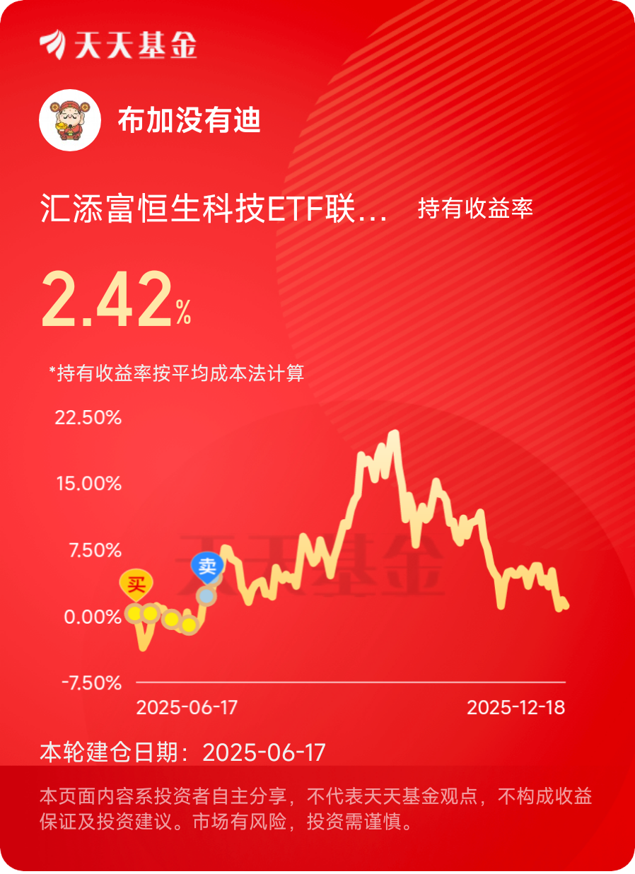 投资是一场漫长的修行,选择正确的策略与优质的资产,胜过无数次的短线择时。哑铃策略作为久经市场考验的配置方案,为投资者指明了方向;而汇添富恒生科技ETF联接发起式(QDII)C与汇添富中债7-10年国开债E的组合,则是这一策略在2026年市场环境下的最优实践之一。坚定长期持有信念,坚持分批加仓操作,相信时间会成为优秀资产的朋友,在攻守兼备的布局中,收获属于耐心投资者的长期红利。@汇添富基金 #晒收益#
