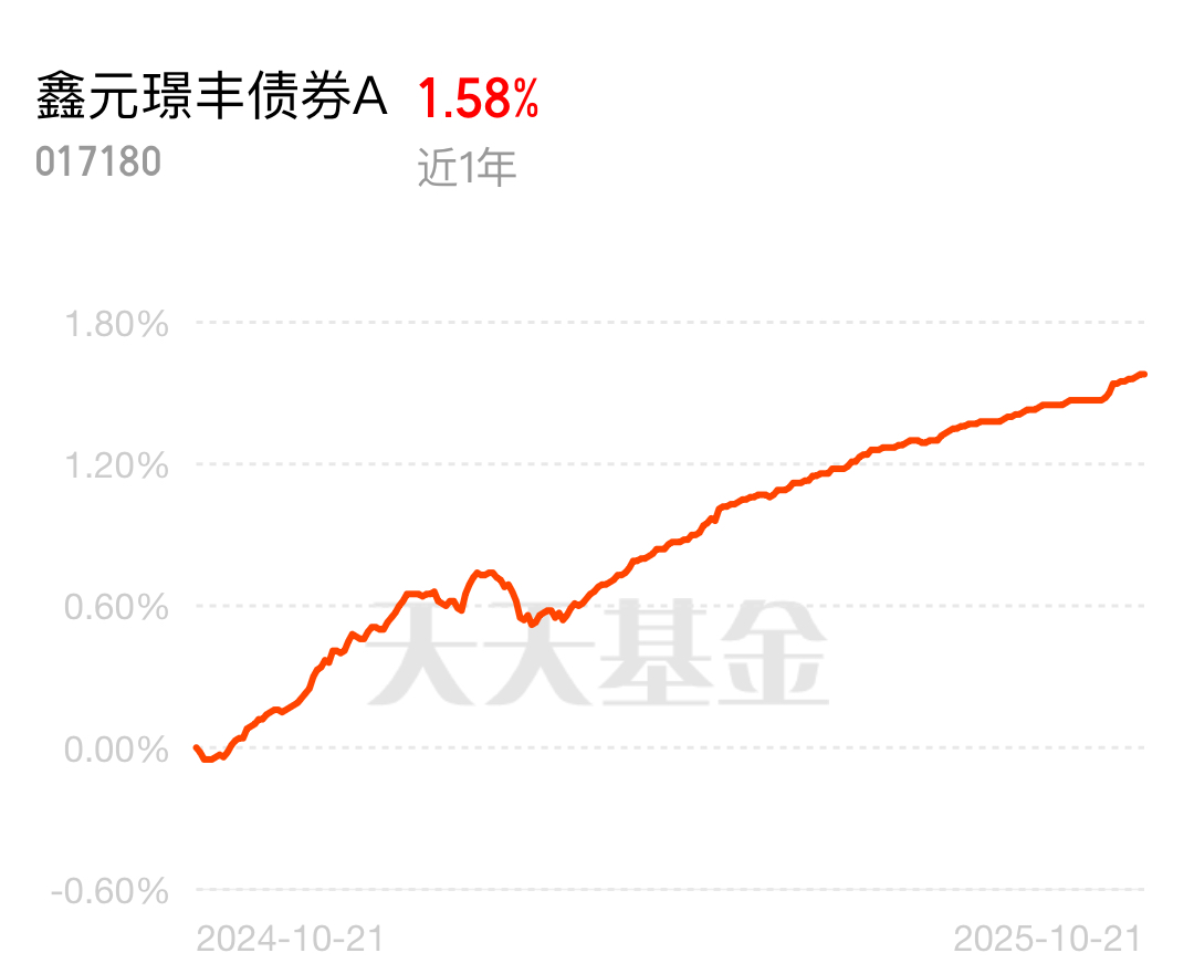 很多人觉得债基收益低,但行情不好时才显优势,现在调整正是机会。鑫元璟丰债券A近1年收益1.58%,稳稳拿住,后续收益有保障。