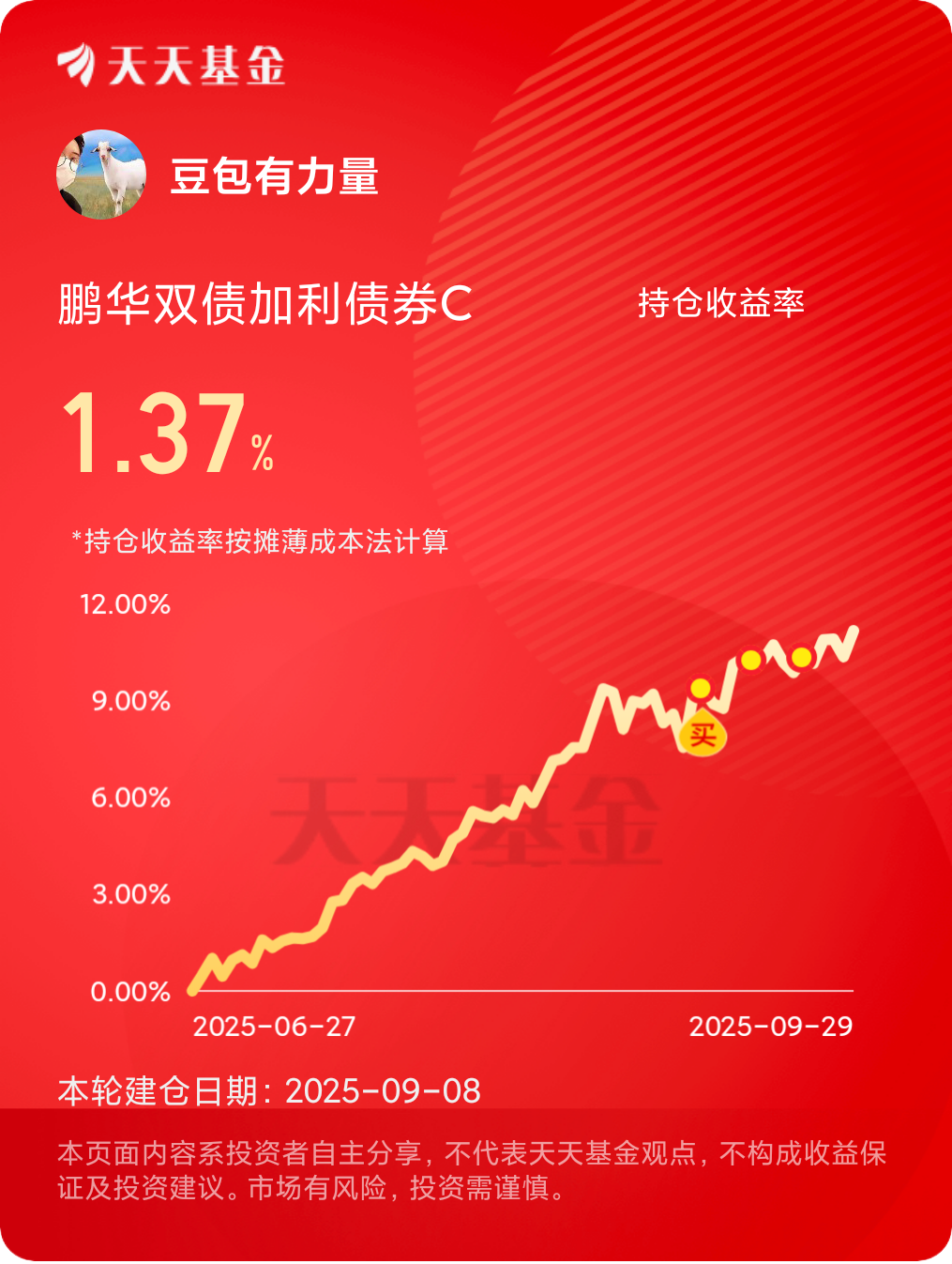 今天真不错呀,布局的$鹏华双债加利债券C$也成功收了74个蛋,表现挺好的。基金重