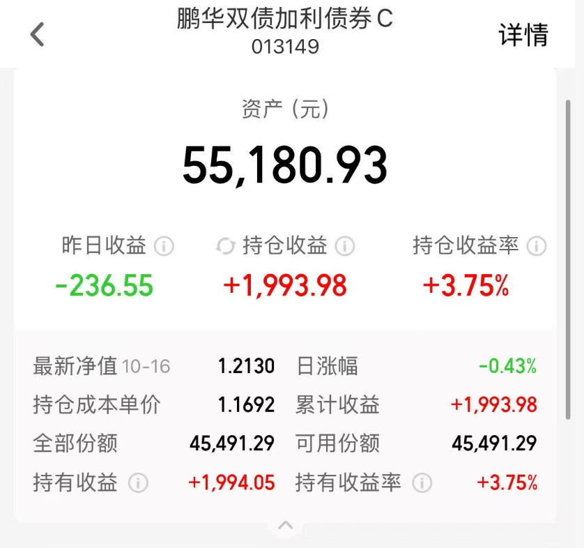 截至午盘债券持续回暖,权益再走弱,双债加利昨日跌到了近期的一个相对低点。虽然这只产品的年化收益率依旧在20%以上,但我个人目前整体持仓收益被加仓和回调摊薄,持仓收益率来到3.75%。整体看是远高于我的纯债持仓收益。