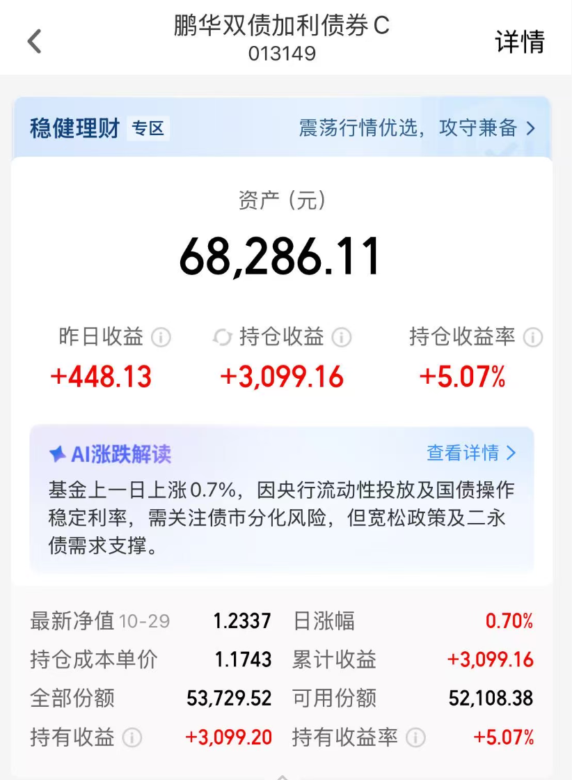 我长期买入持有的鹏华双债在我的频繁加仓下还是又回到5%+收益了,一只固收加产品靠着少量权益抛出了权益某些指数的收益率,很好。继续干,未来不会差。