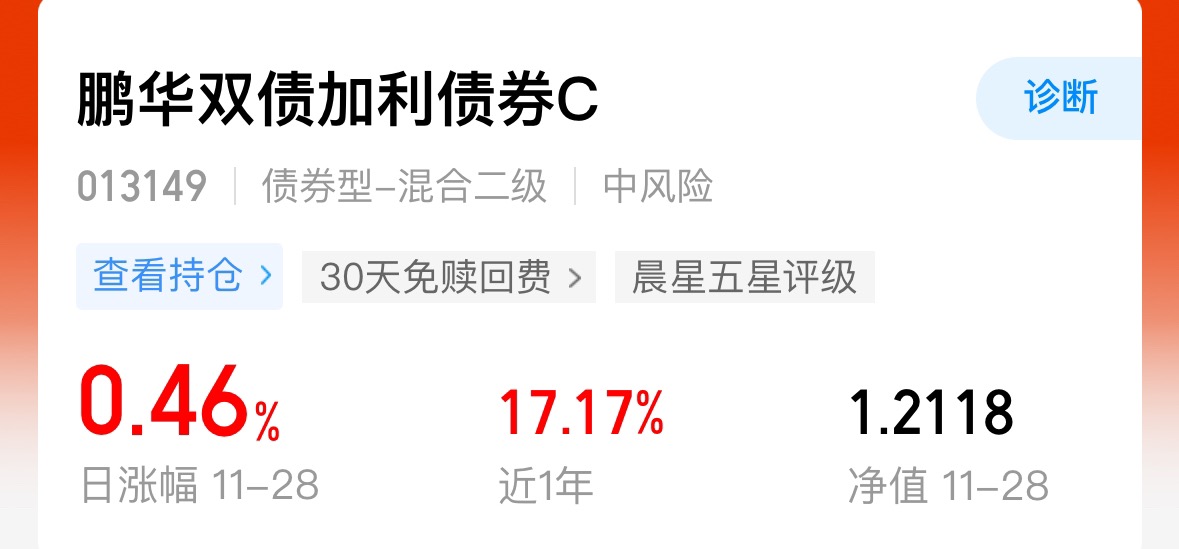 刚看了下$鹏华双债加利债券C$上周五爆了46个蛋,爆发力确实很不错,今天看样子也