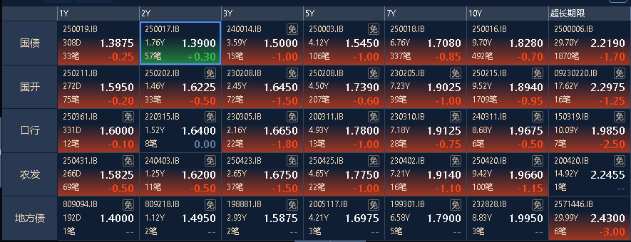 债市连续3日上涨,消息面冷清,市场等待jj工作会议通稿出炉,长端涨幅较昨日收窄,整体维持1BP以内下行幅度,超长端持续强势,部分超长老券日内下行1-2BP,"25特6"与"25特2"利差重新走阔至2BP以上,中短端现券表现更优,多头情绪旺盛,活跃券普遍下行1BP左右,分歧指数看,交易盘,保险为今日买入主力。