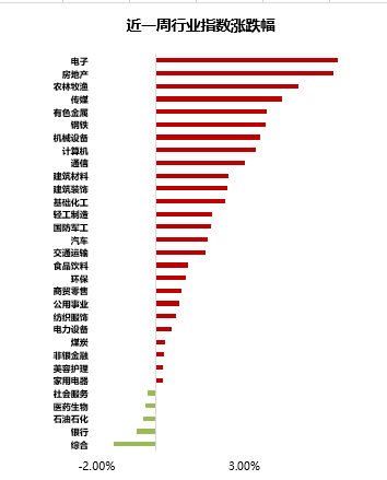 l 上周(2025.9.8-2025.9.12),主要宽基指数全部上涨。上证指数上涨1.52%,创业板指上涨2.10%,沪深300上涨1.38%,中证500上涨3.38%,中证1000上涨2.45%,科创50上涨5.48%。风格上,主要风格指数全部上涨,其中成长(+3.56%)风格领涨。从申万一级行业看,周内行业多数上行,其中领涨的行业有电子(+6.15%)、房地产(+5.98%)、农林牧渔(+4.81%)。(数据来源:iFind)