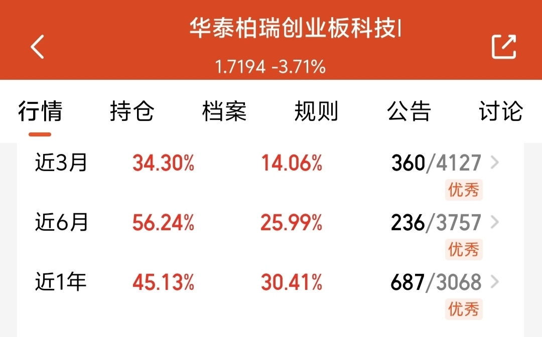 $华泰柏瑞创业板科技ETF发起式联接C$ 今天估值大涨4%以上,半年收益都56%了,科技还是主线啊,继续看好。