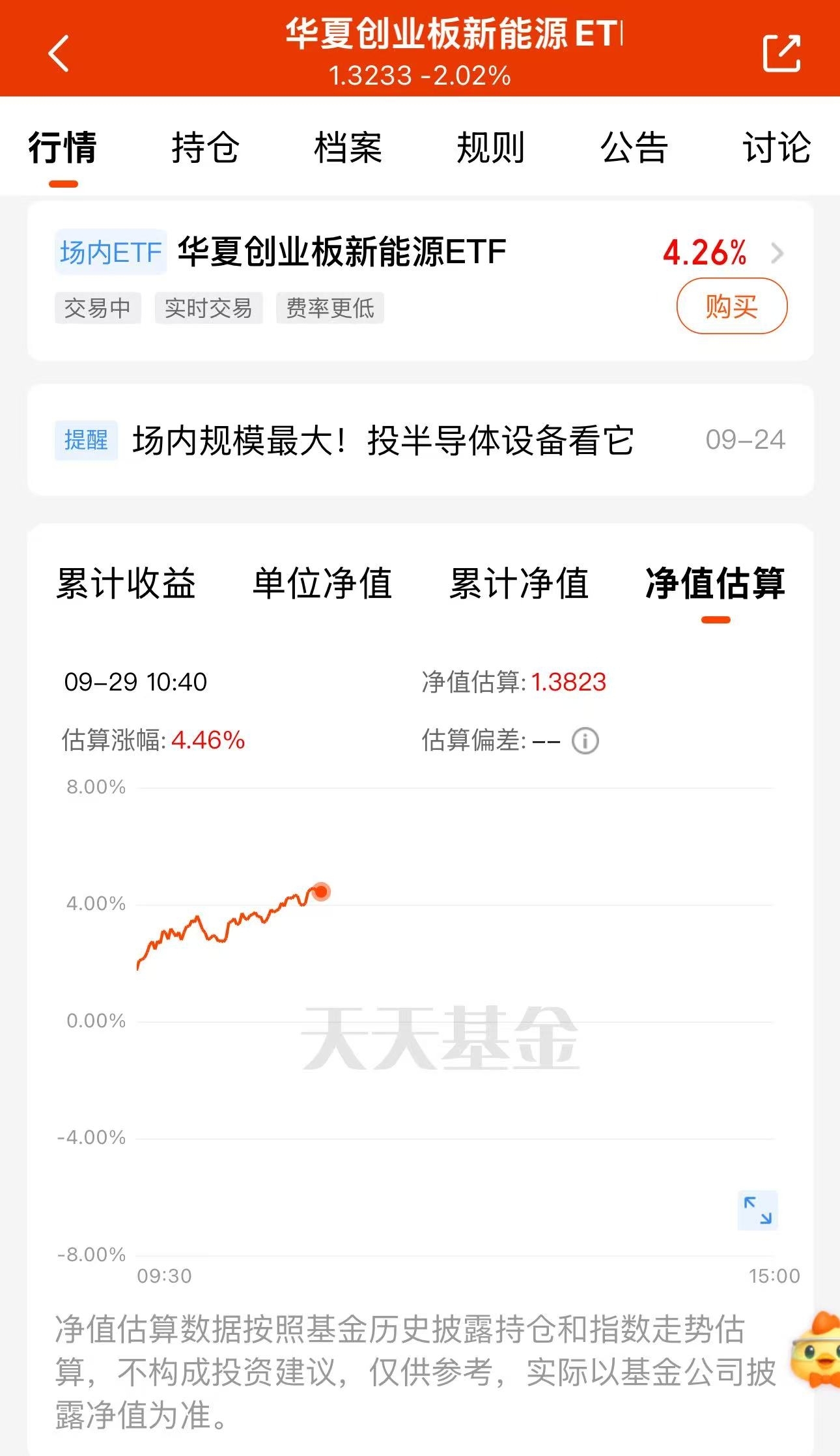 这么猛的4%+,还好前几天回调趁低加了,果然逢跌加仓明智啊,成立一个多月就有32%+的收益了$华夏创业板新能源ETF发起式联接C$