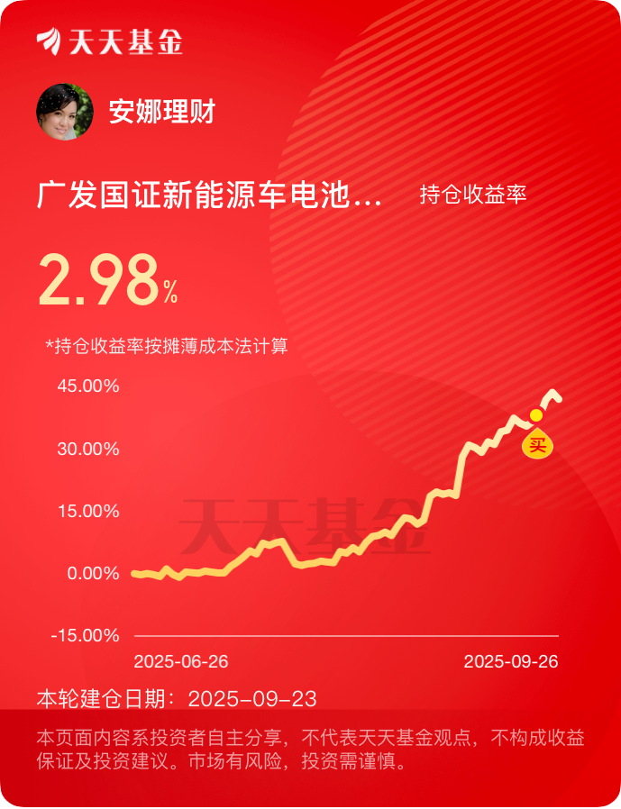 此前投的这只广发国证新能源车电池ETF联接C,今日大涨4.7%,账户整体持仓收益已超 7% 。